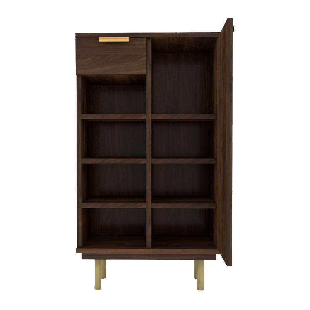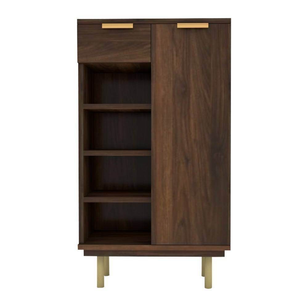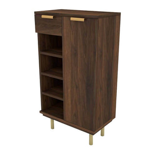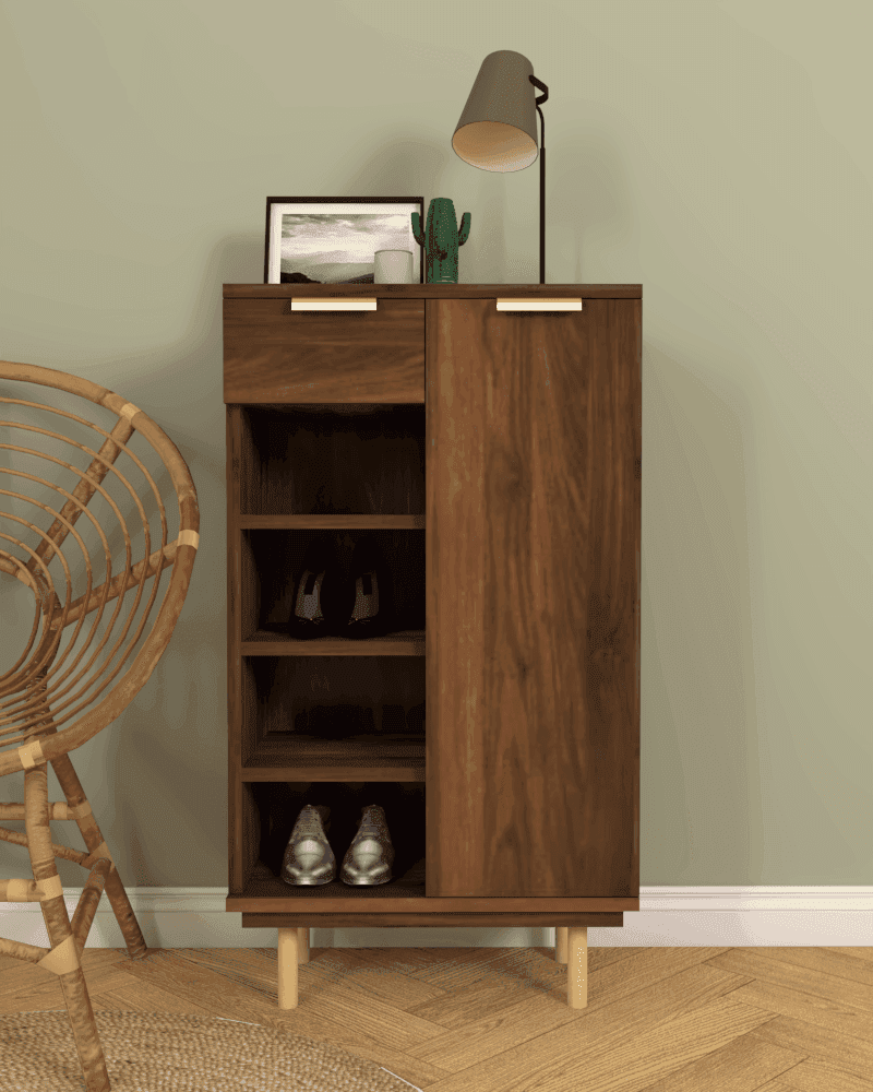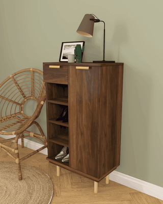 The Cheyenne Shoe Cabinet features one convenient drawer and a cabinet door, accented with elegant gold handles that add a touch of luxury. This shoe cabinet is great for keeping your footwear organised and your entryway clutter-free.