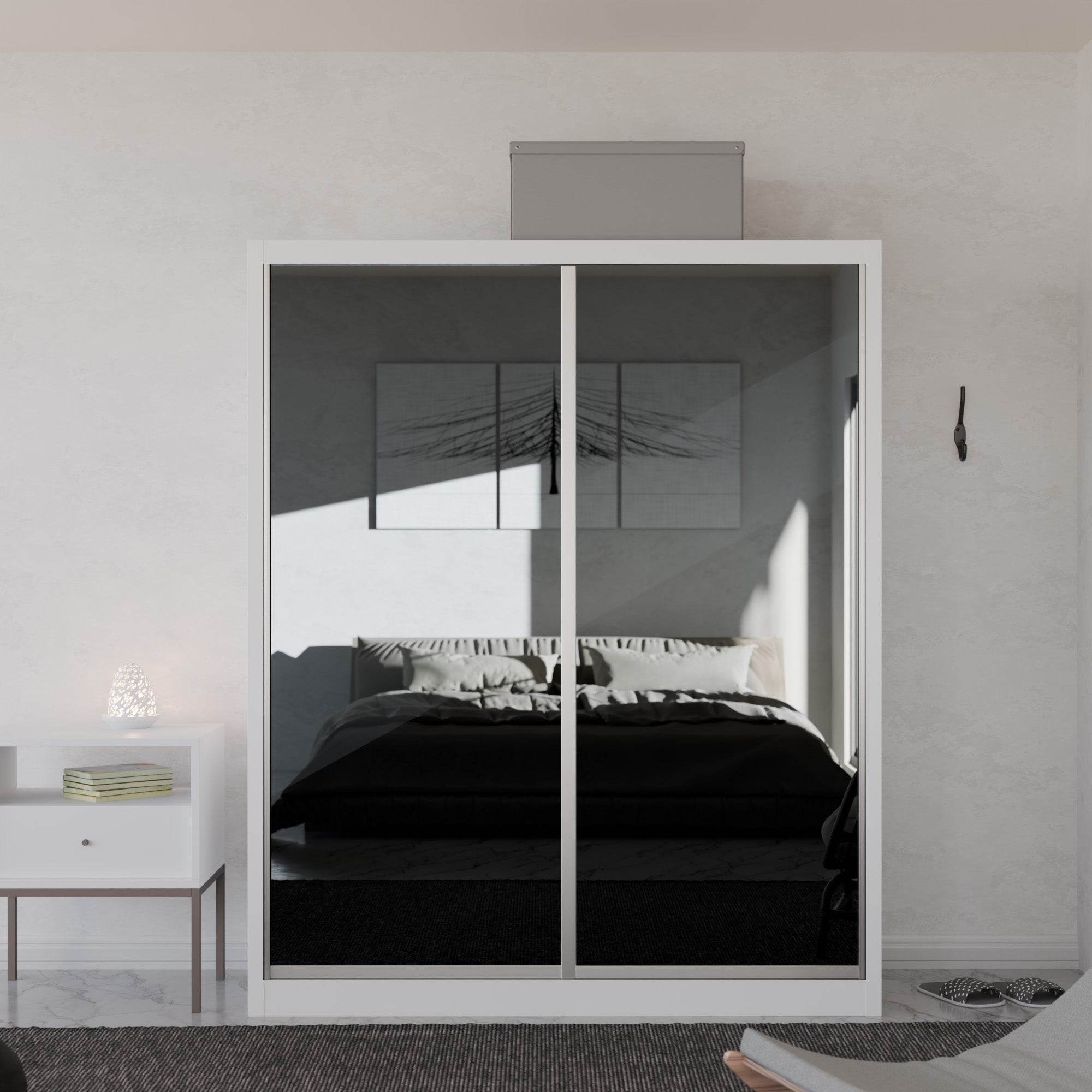 The Amity Modular Wardrobe frame is constructed with particle board frame, with a plywood backing and laminate finish. The doors are made of black glass mounted on aluminium frame that slides on a smooth sliding door track system.