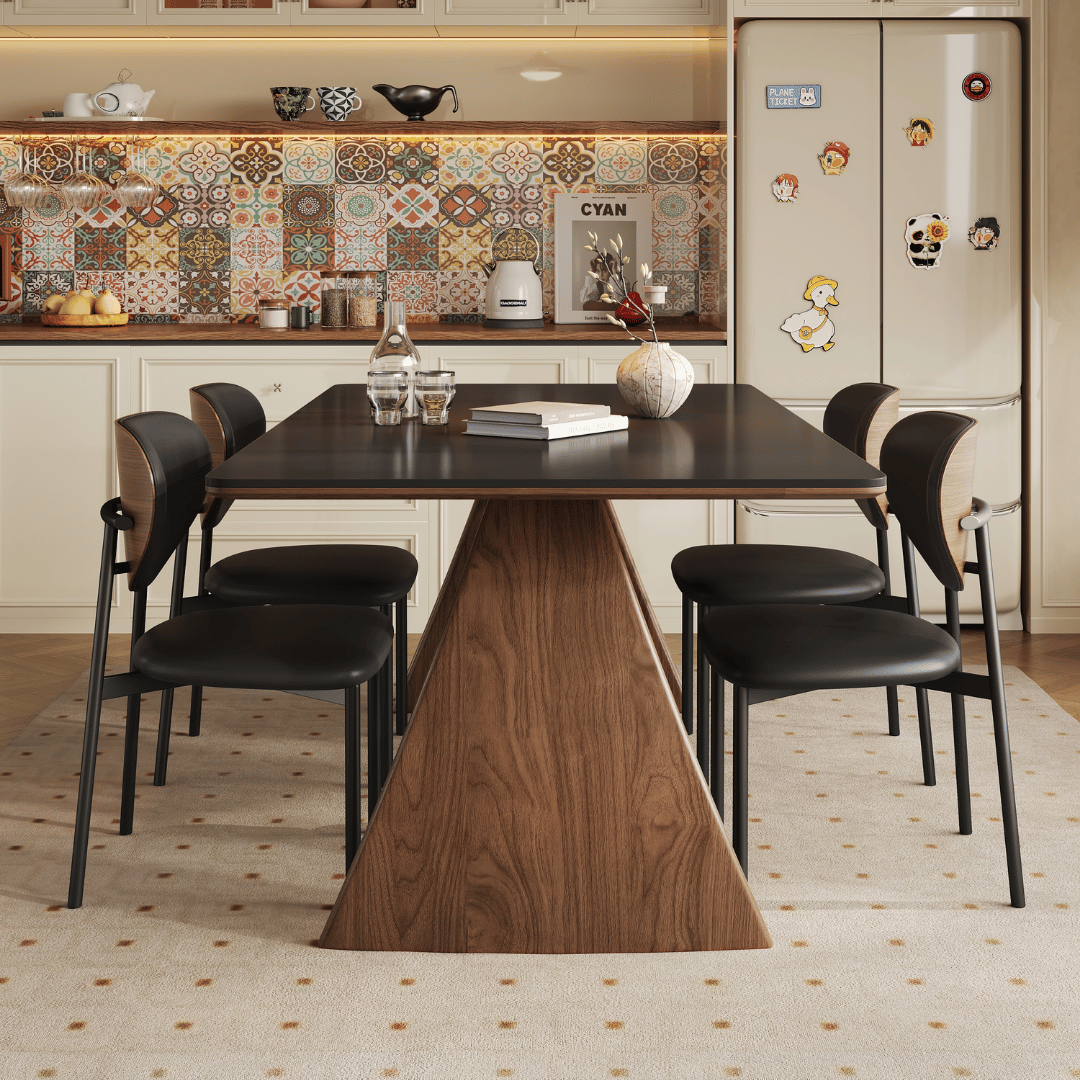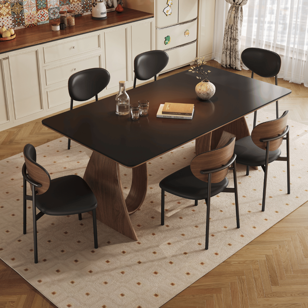 • Designer "Wing" Chairs: Accompanied by ergonomic chairs featuring curved walnut backrests and premium black leatherette seats, echoing the table's elegant curves and dark palette.