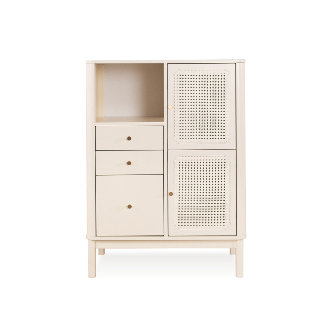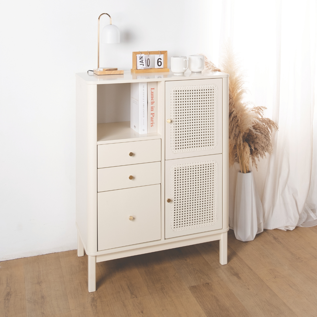 | Vorie Chest of Drawers - Cream/Rattan | Creamy Off-White & Natural Rattan | L750 x W450 x H1018 mm | Wood Veneer, Solid Wood & Rattan |