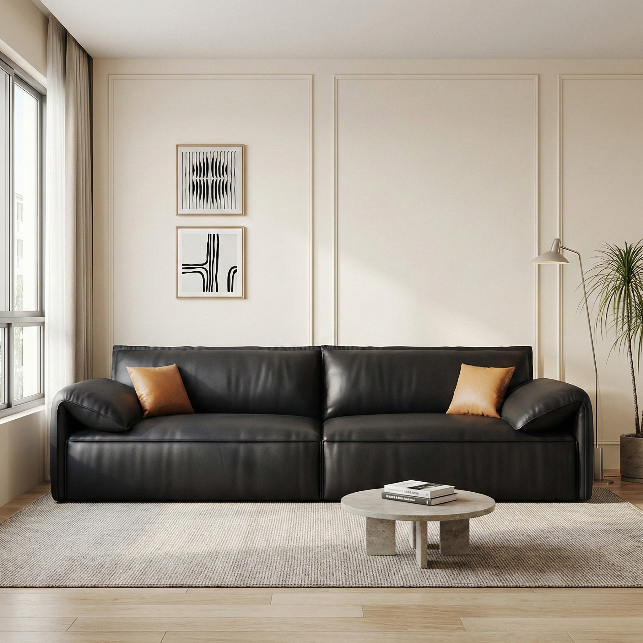 A bestselling choice for small apartments, this sofa is upholstered in premium faux leather featuring a smooth refined surface with a subtle satin sheen. The sleek finish offers the sophisticated look of leather while remaining practical for everyday living. Its clean low-profile silhouette and gently curved armrests maximize seating without visually overwhelming compact spaces.