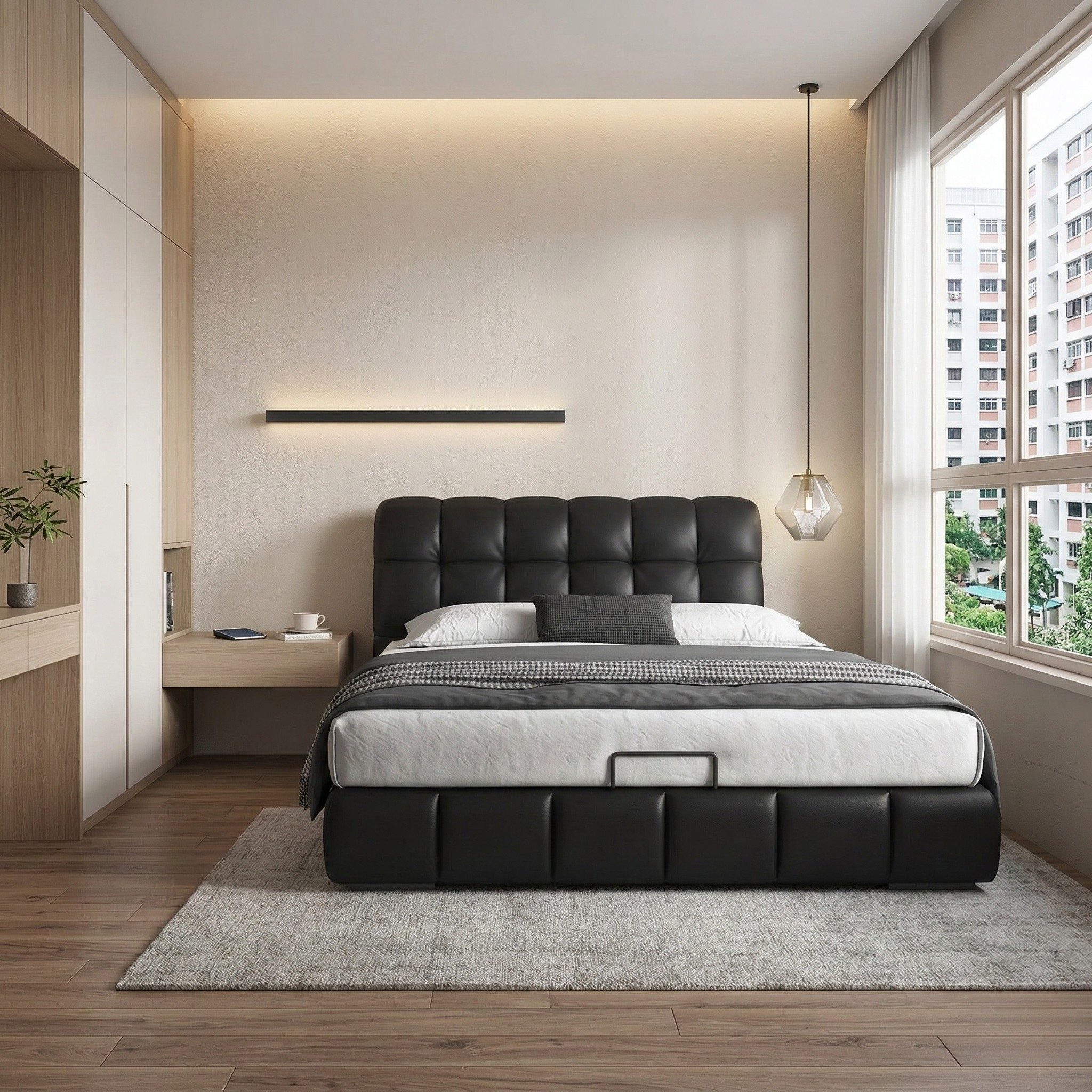 The headboard showcases a structured panel design with pull-point tufting, adding depth and tailored character while maintaining a clean and minimalist silhouette. Generously padded with high-resilience sponge cushioning, the backrest delivers supportive comfort for sitting upright while reading, relaxing, or unwinding in bed, while maintaining its shape over time.