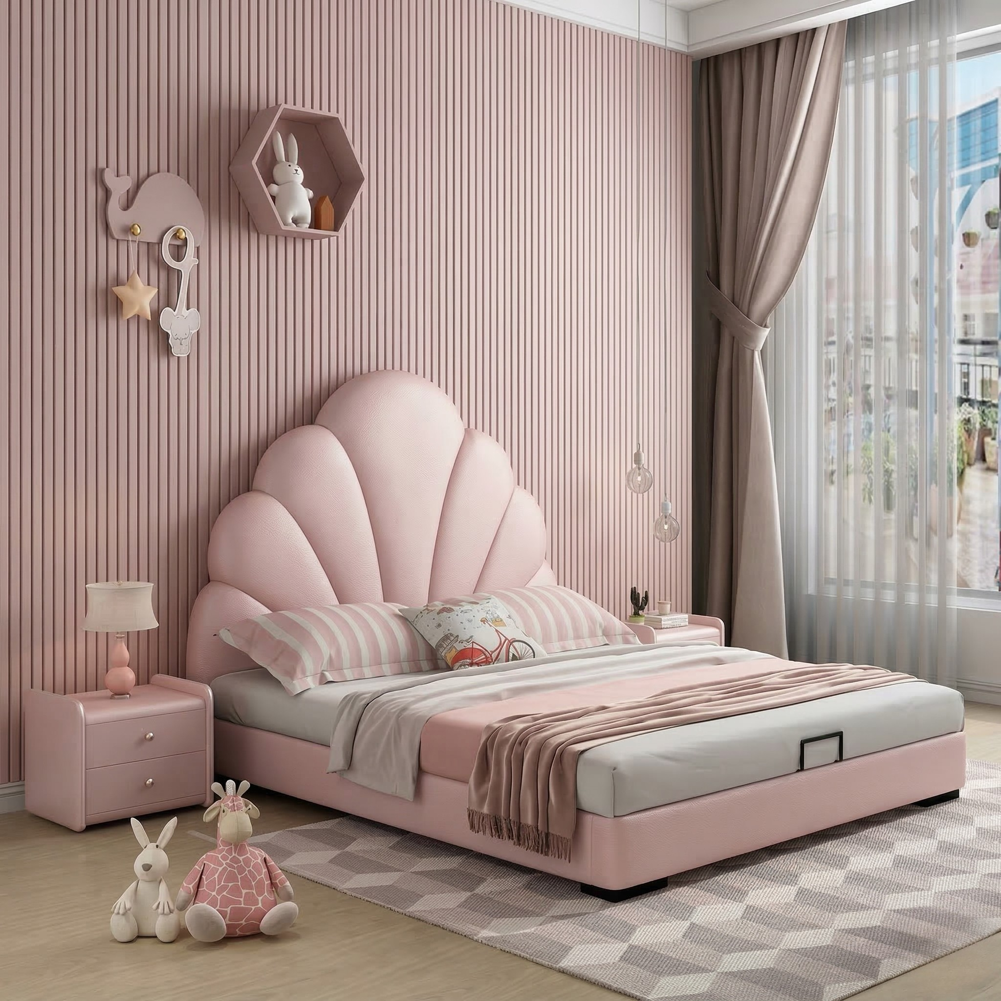 The design is highlighted by a scalloped shell-inspired headboard, composed of softly curved panels that fan outward like delicate seashell petals. This graceful form creates a charming and decorative focal point while maintaining a clean, modern aesthetic. Filled with high-resilience foam cushioning, the headboard offers plush support, making it comfortable for reading, relaxing, or unwinding before sleep.