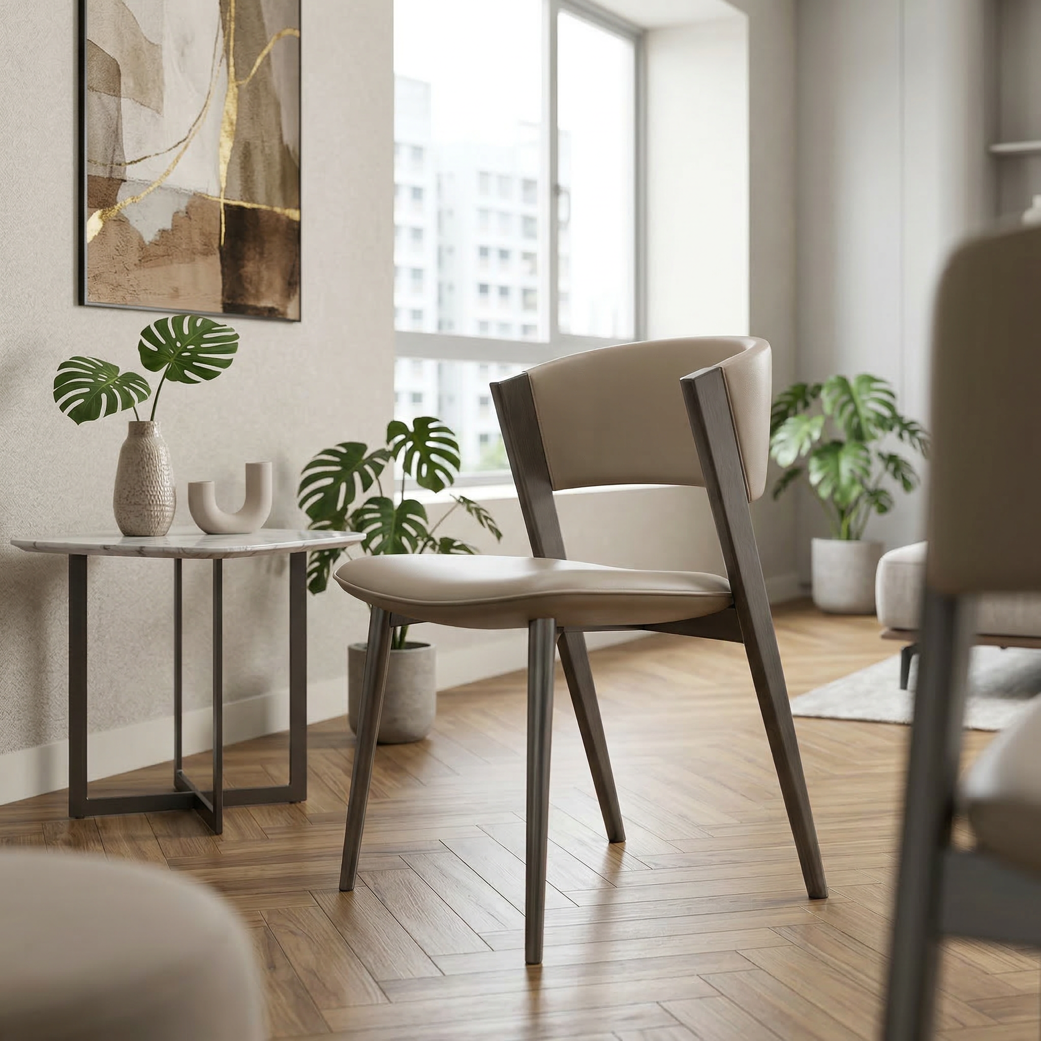 A refined neutral palette contrasted with a dark frame allows the Aven to pair effortlessly with a wide range of dining tables and interior styles—from modern minimalist to Scandinavian-inspired homes.
