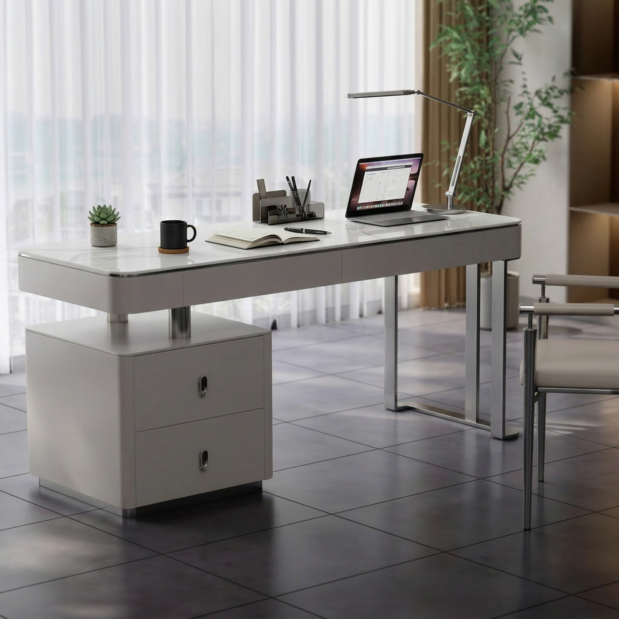 The tabletop features a 6mm sintered stone surface with a subtle marble-inspired finish, adding a sleek and sophisticated touch to the workspace. This premium surface is highly resistant to scratches, heat, and stains—making it ideal for daily use while maintaining its elegant appearance over time.