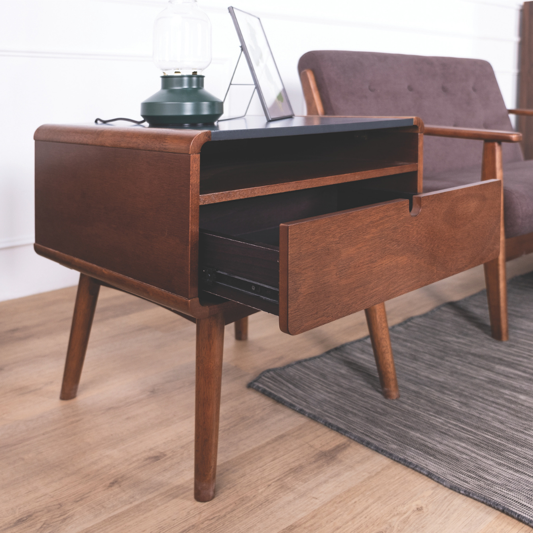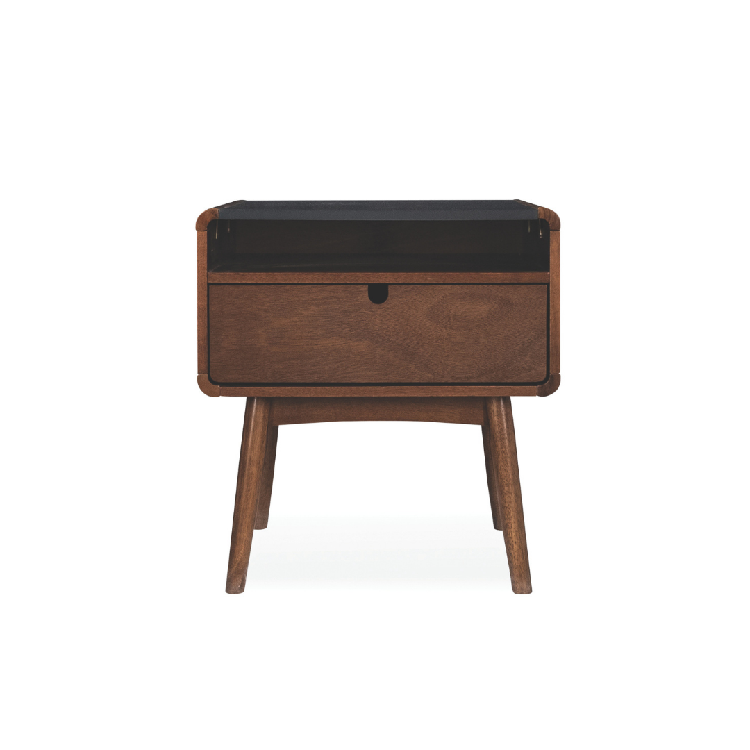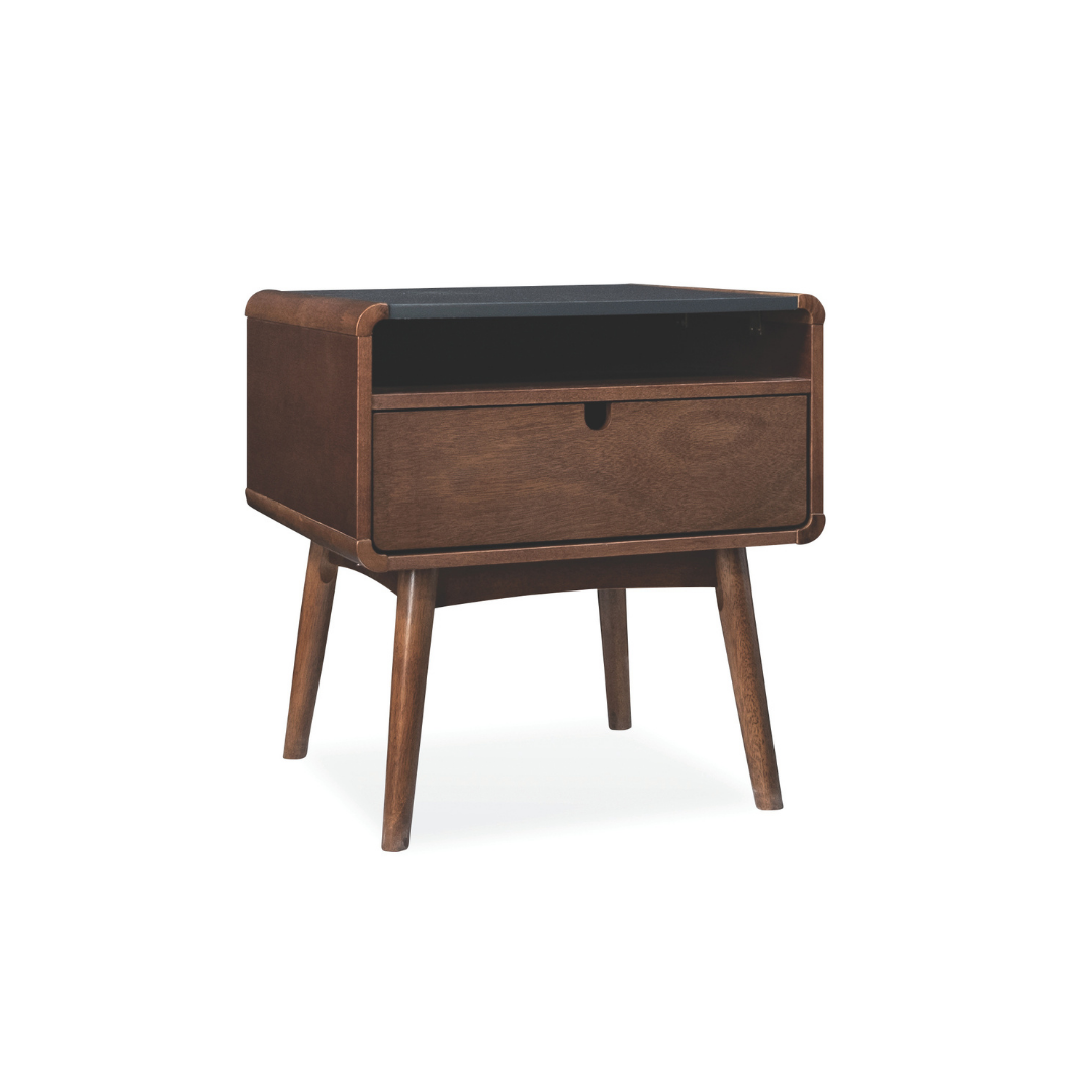 Elevate your bedside with Mid-Century sophistication and practical storage.