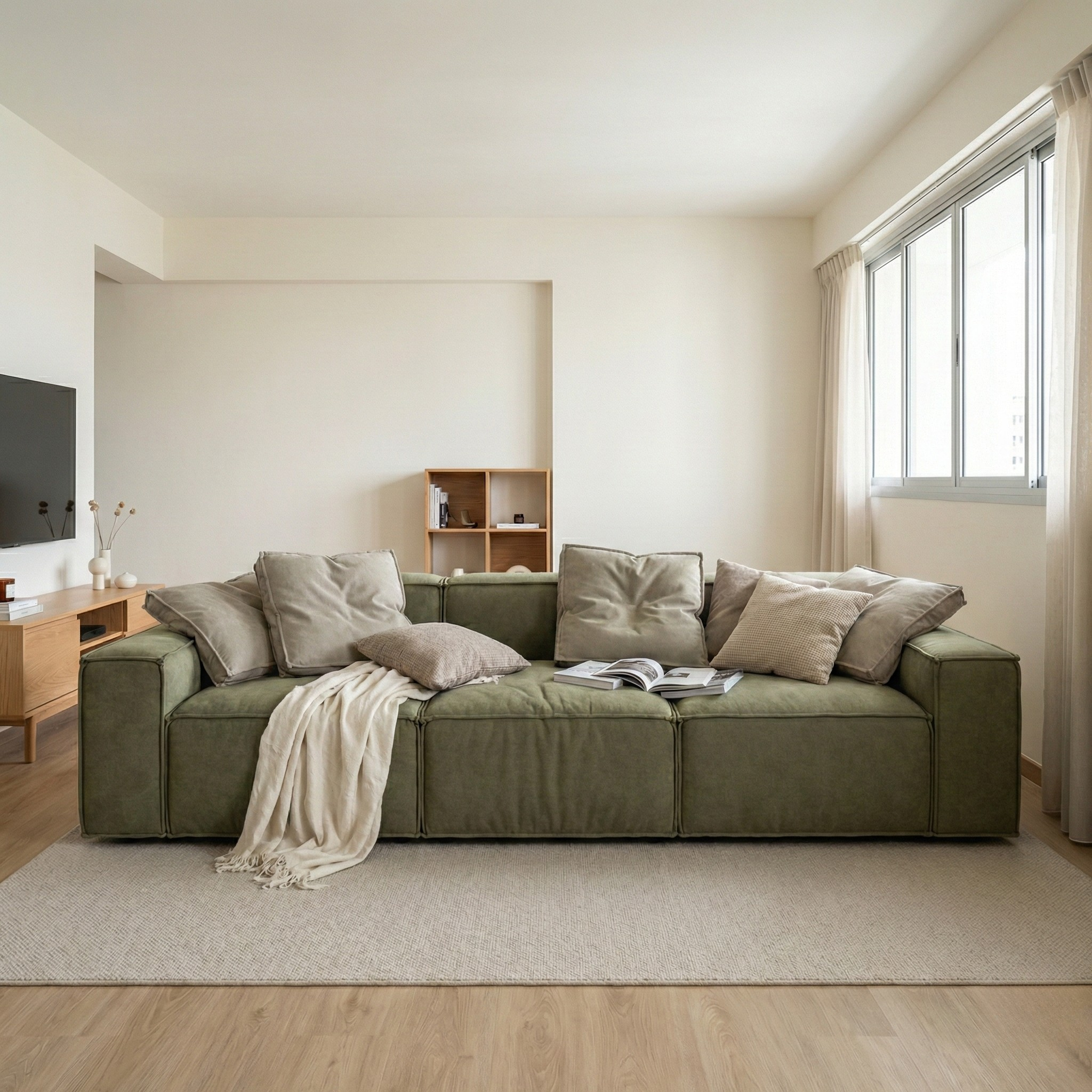 The Corvyn Fabric Sofa is upholstered in premium frosted technological fabric imported from Russia, featuring a soft matte finish with a subtle “fallen leaves” texture that adds depth and organic character to its clean contemporary form. Designed for durability and breathability, the fabric offers everyday practicality while maintaining a refined, modern aesthetic.