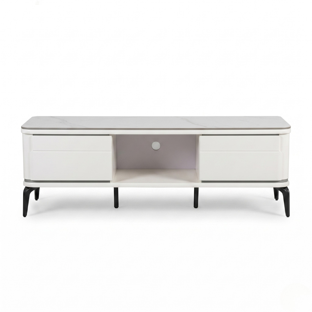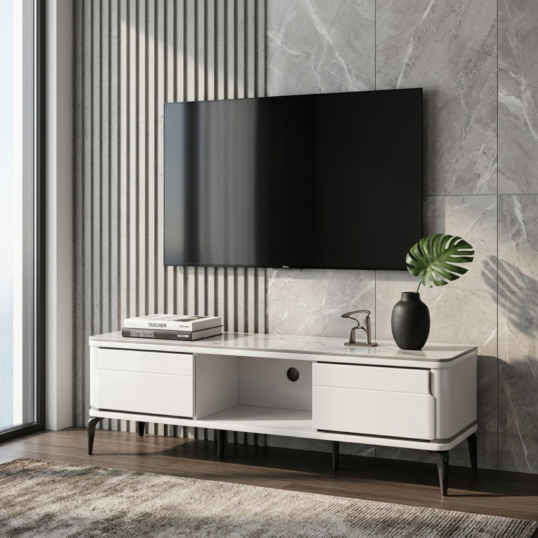 Transform your entertainment zone into a gallery-ready space. The Dallas TV Console is topped with high-performance gloss sintered stone, a material renowned for its incredible durability. It is heat-resistant, scratch-proof, and non-porous, ensuring that your heavy equipment, soundbars, and decor won't leave a mark. The beautifully rounded "pill" corners echo the soft-modern design trend, removing sharp edges for a safer, child-friendly home environment.