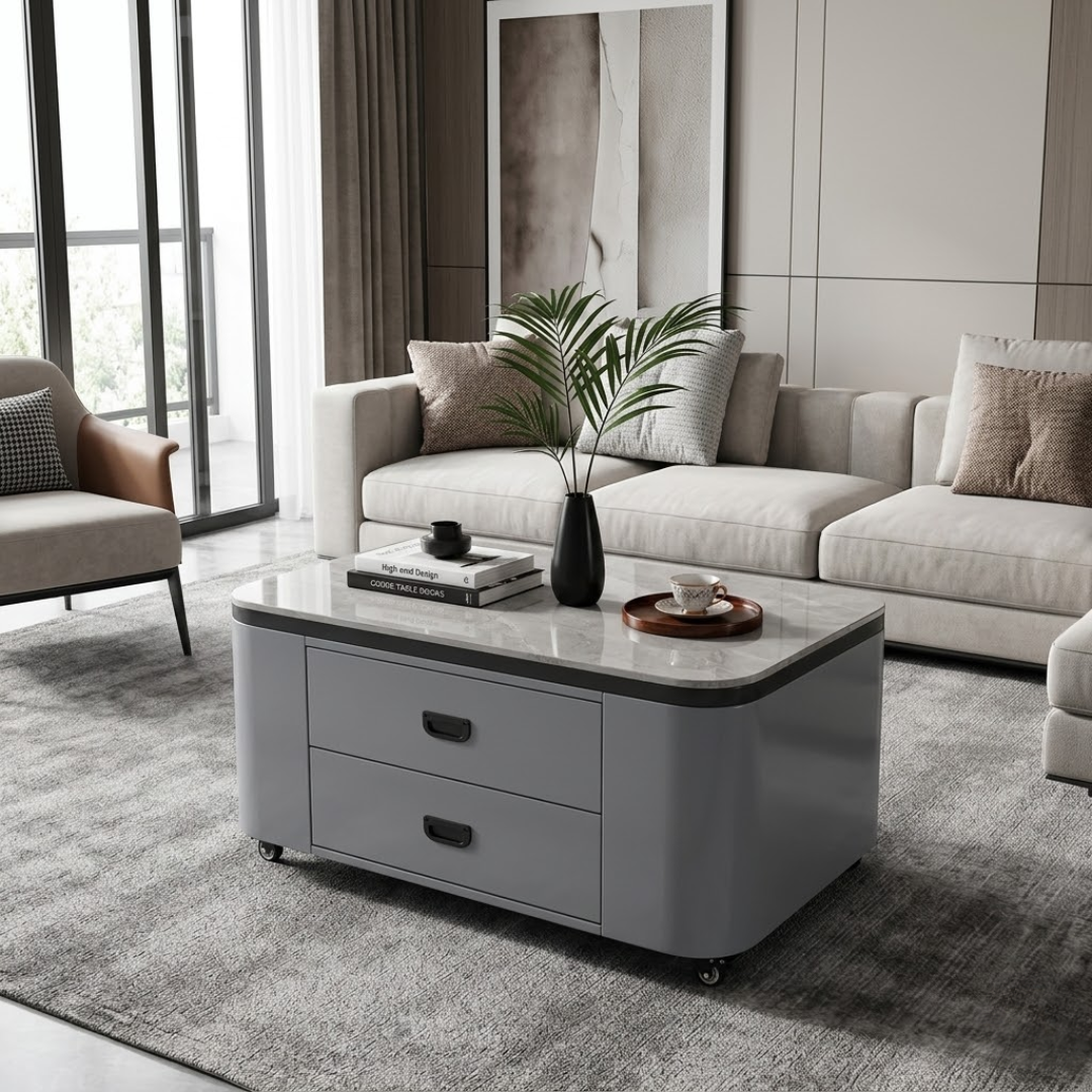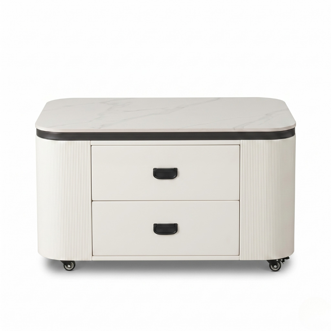 In a bustling household, versatility is key. The Dinelle Coffee Table offers a unique mobile design thanks to its 360-degree rotating wheels. Whether you need to move it aside for your robot vacuum or bring it closer for a workspace, the integrated locking mechanism ensures it stays firmly in place once positioned. The tabletop is crafted from high-gloss sintered stone, providing a surface that is virtually indestructible: heat-resistant, scratch-proof, and non-porous for a lifetime of easy maintenance.
