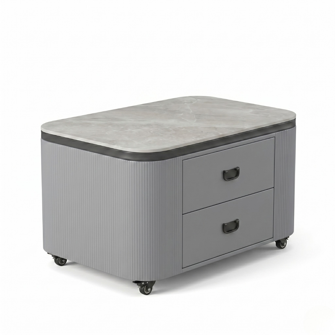 | Dinelle (Grey) | Grey Gloss Stone / Grey Fluted Body | 800 x 500 x H440mm | Sintered Stone, MDF, Casters |