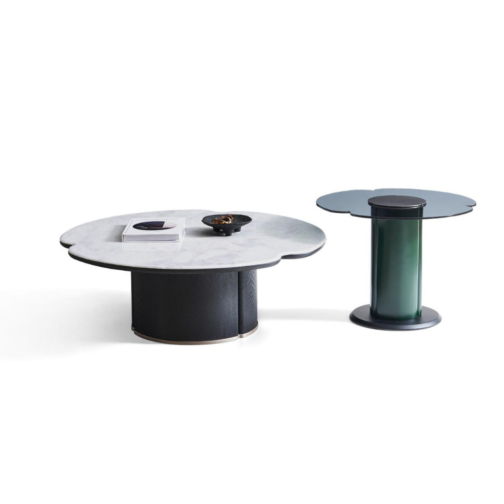 Organic, Petal-Shaped Tops: Both the main coffee table and the side table feature tops with an undulating, soft, petal-like contour.