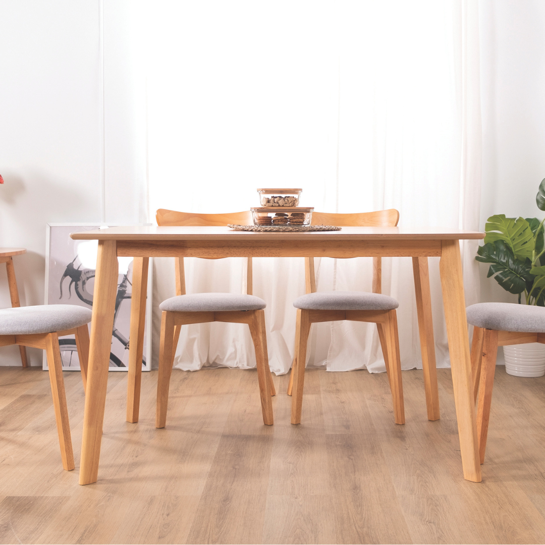 The Leighton is crafted for those who appreciate the beauty of "Quiet Luxury." Constructed from durable solid rubberwood, this 1.2-metre table is perfectly sized for HDB dining nooks and condo apartments, comfortably seating up to four adults. Its soft, rounded corners and bevelled edges aren't just a style statement—they offer a family-friendly design that’s safer for households with young children.