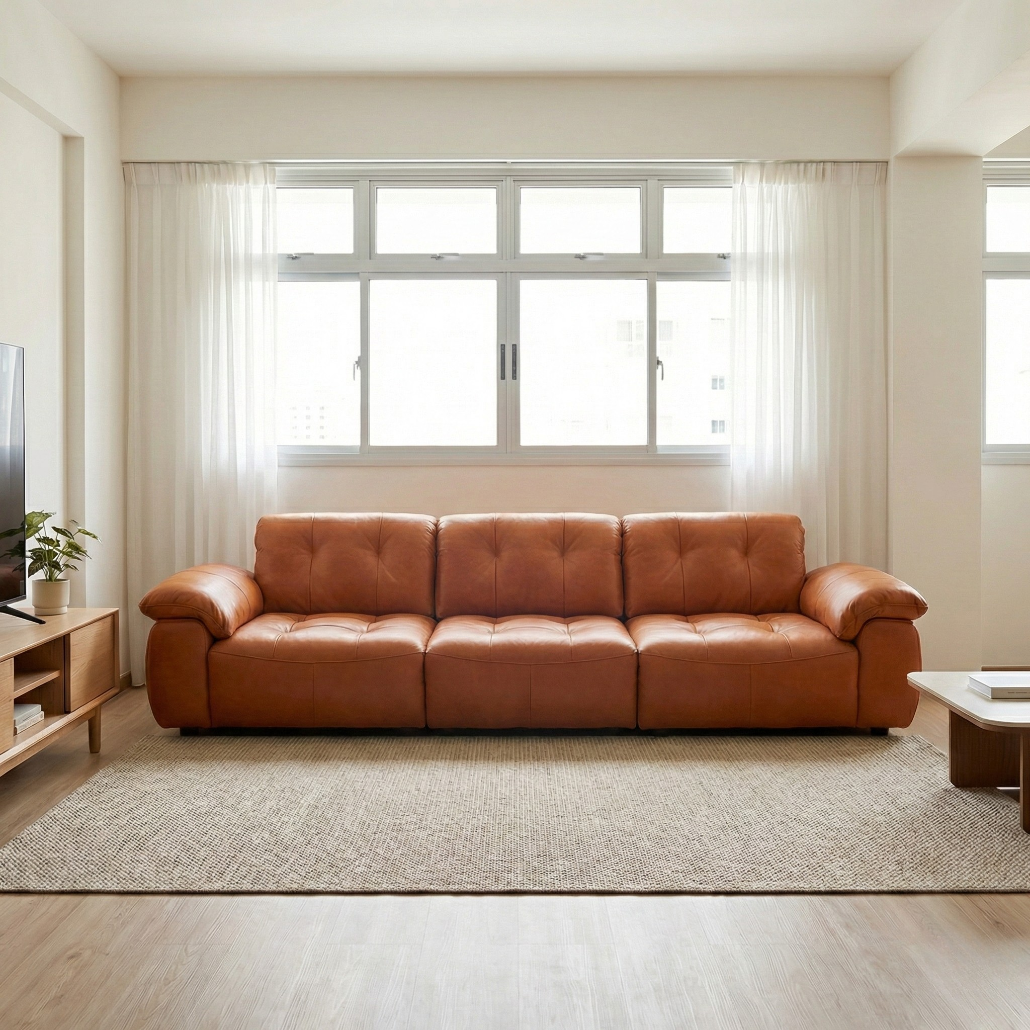 Upholstered in premium faux leather or genuine leather, the surface showcases a smooth calfskin-inspired texture with a refined natural sheen. The supple finish enhances its luxurious presence while remaining durable for everyday living. Deep tufting across the seat and backrest adds visual depth and plush structure, creating a bold yet inviting silhouette.