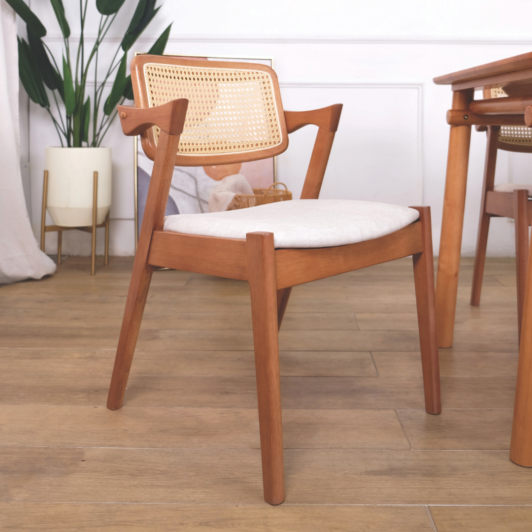 The Parvin is more than just a seat; it’s a design statement. Crafted from durable solid rubberwood, the frame features sharp, clean lines and integrated armrests that create a fluid, sculptural look. The standout feature is the intricately woven PE rattan backrest, which provides breathable support—perfect for staying cool in our tropical climate—while adding a touch of vintage "cane" aesthetic to your interior.