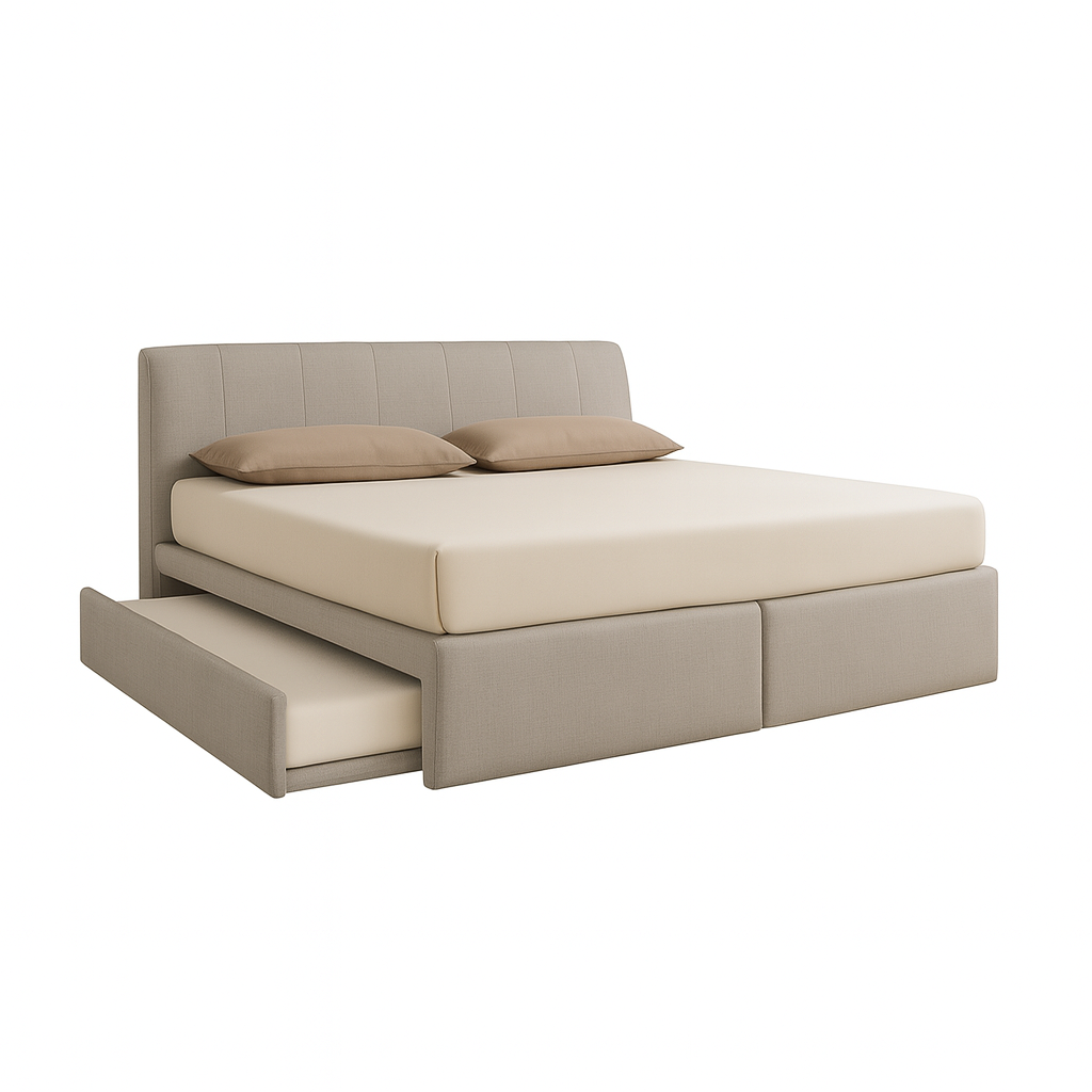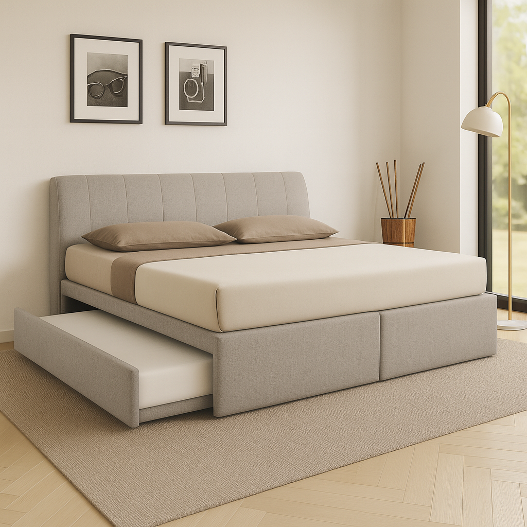 Available in Queen or King size, the Quebee offers spacious comfort without compromising floor space. Just slide the trundle out when needed and tuck it away seamlessly when not in use.