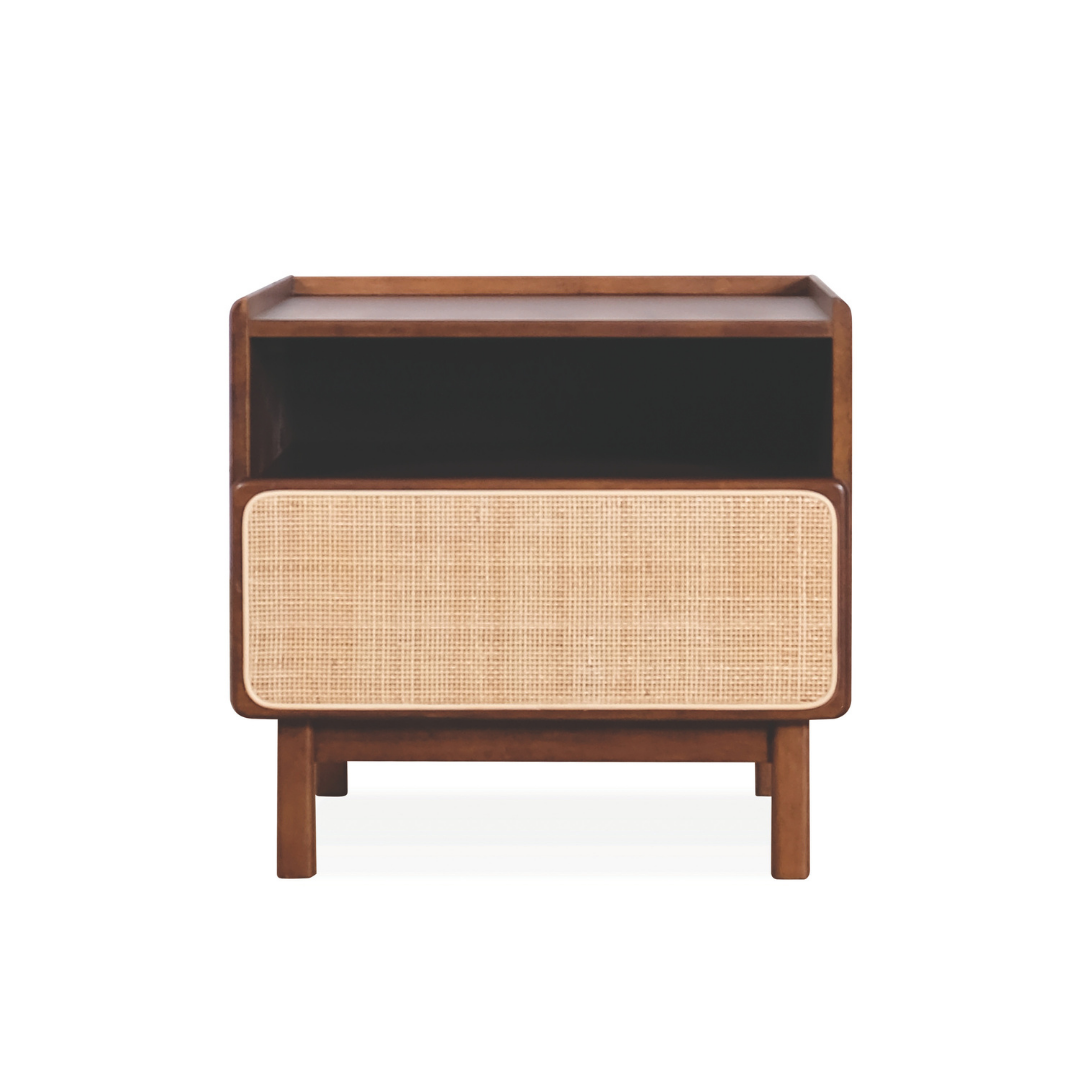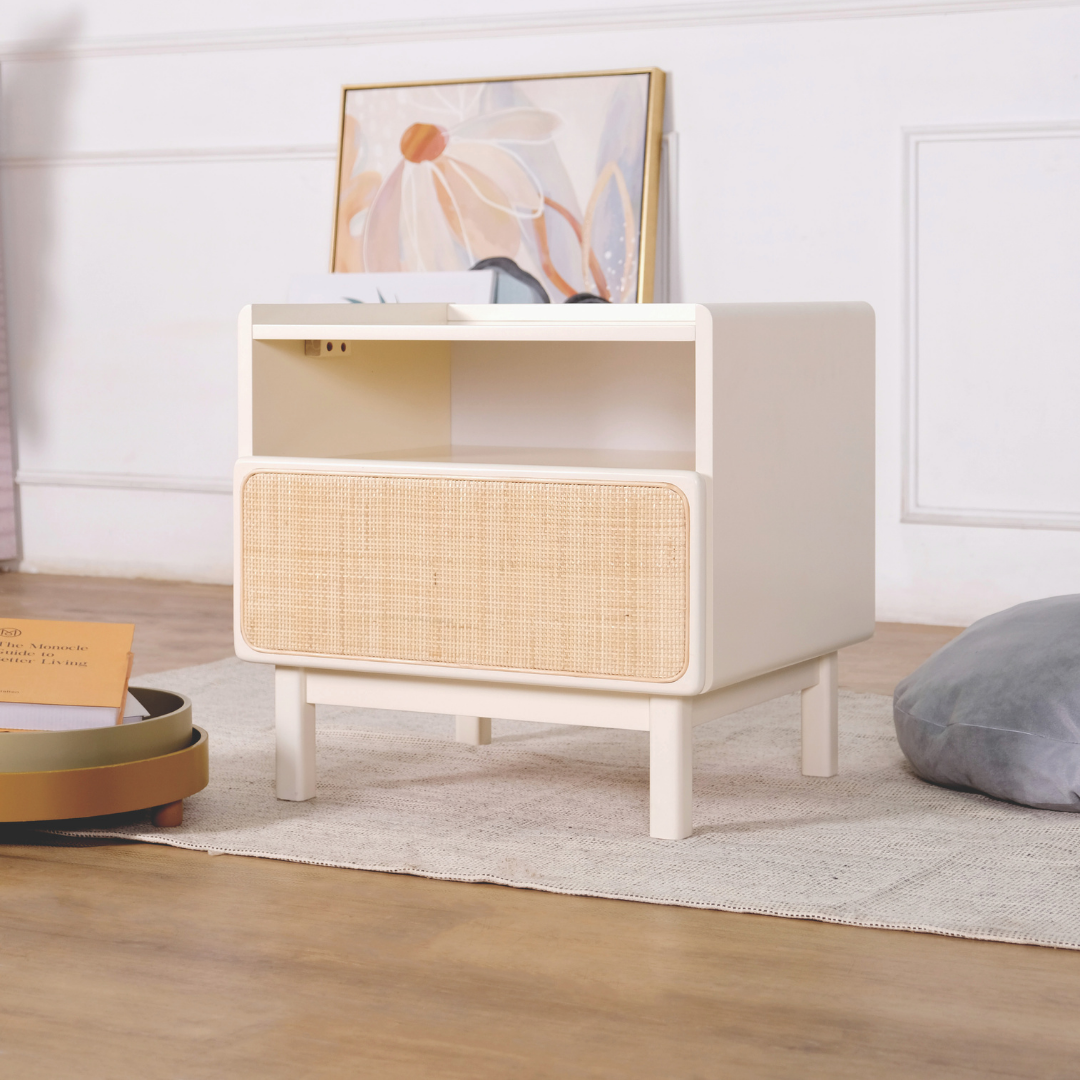In a world of fast furniture, the Rino stands out with its thoughtful construction and timeless appeal. The standout feature is the beautifully inset rattan drawer front, which provides a tactile, breathable texture that softens the structured wooden frame. Designed for those who value organization, the top open cubby is ideal for your current reads or charging station, while the spacious drawer keeps personal essentials tucked away from sight.