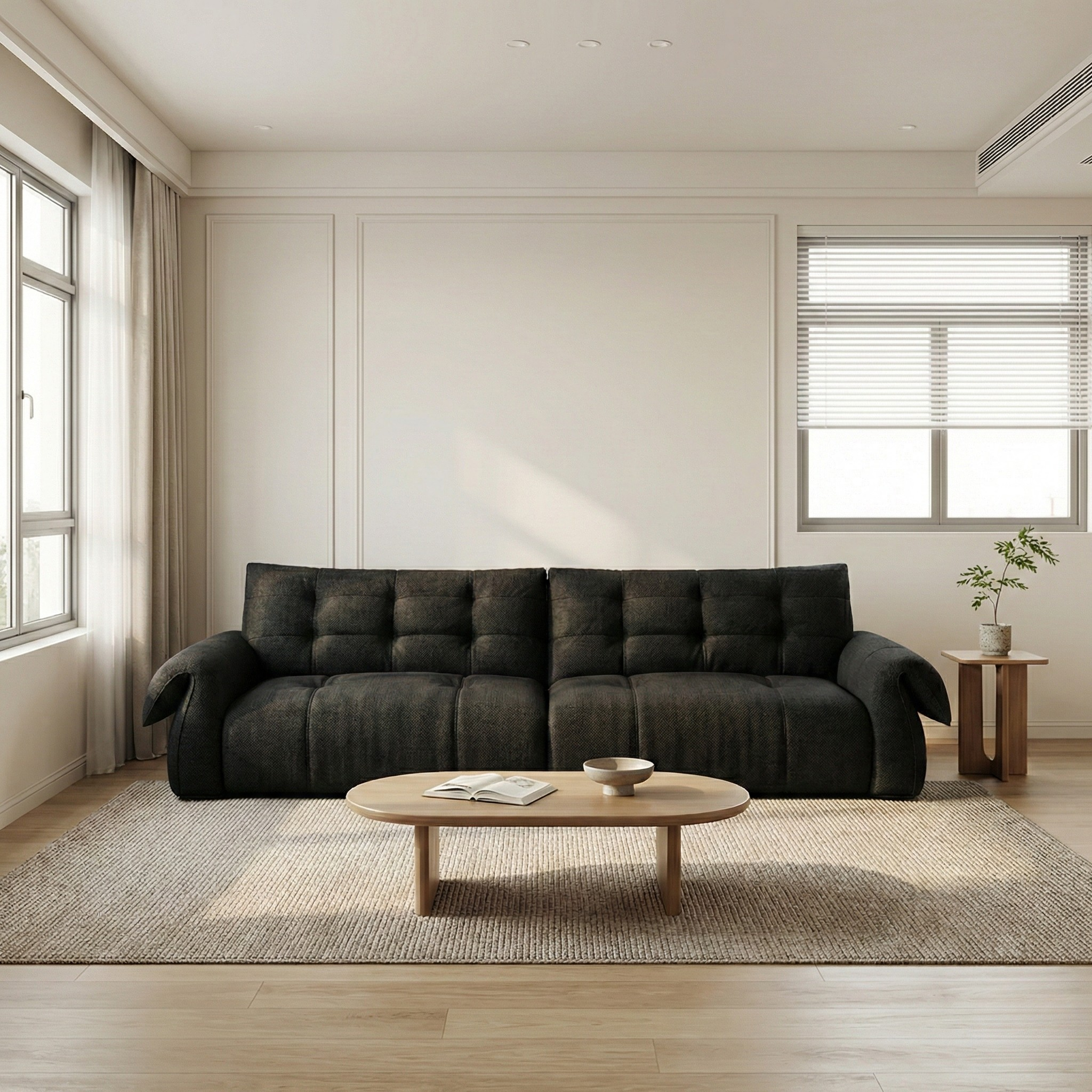 The Vaire Fabric Sofa features a solid larch wood square frame, high-resilience sponge layered with premium down filling, and a distinctive pull-up tufted design — crafted to deliver architectural structure with soft, lounge-ready comfort.