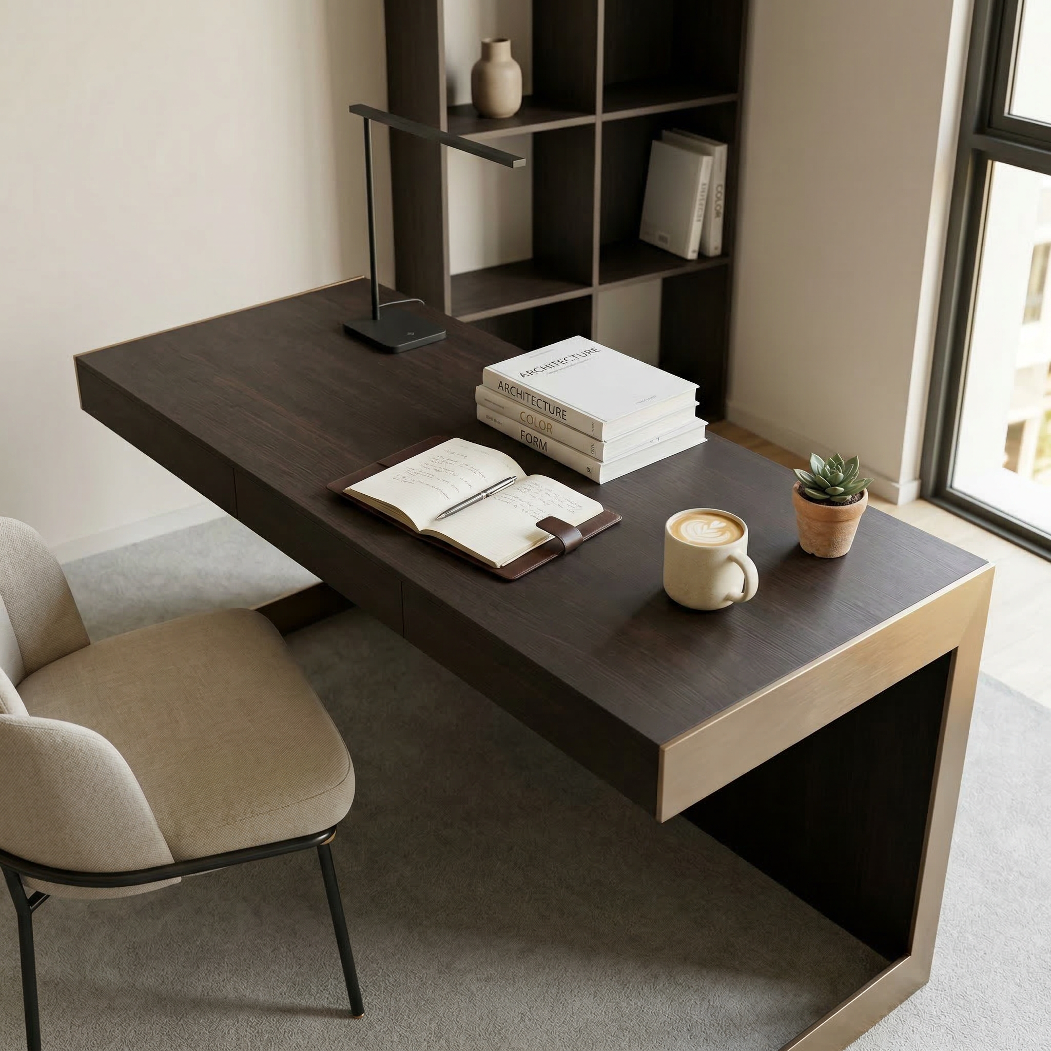 Accented with high-quality stainless steel hardware, the desk introduces a clean metallic contrast that enhances its modern appeal. These stainless steel elements reinforce the structure while adding a subtle industrial edge that complements the rich wood tones.