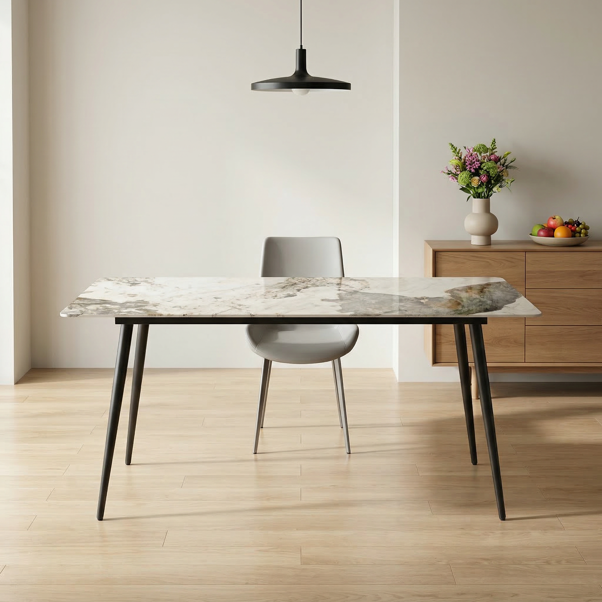 The Zenova Sintered Stone Dining Table combines modern stone elegance with durable steel construction—creating a stylish and practical centerpiece for contemporary dining spaces.