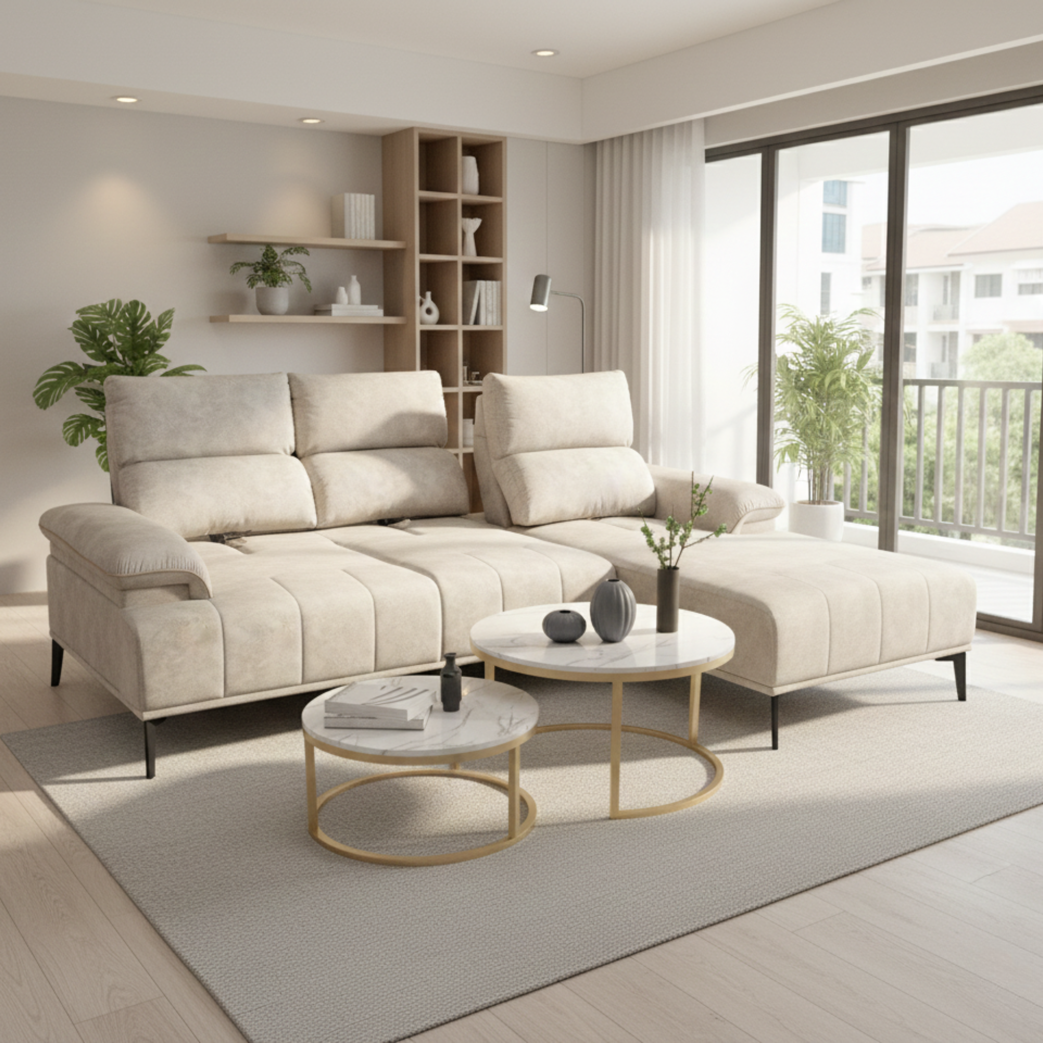 The Orrian Fabric Adjustable Backrest L-Shaped Sofa by Esteller brings comfort, flexibility, and modern design into perfect harmony — a refined statement piece crafted for real everyday living.