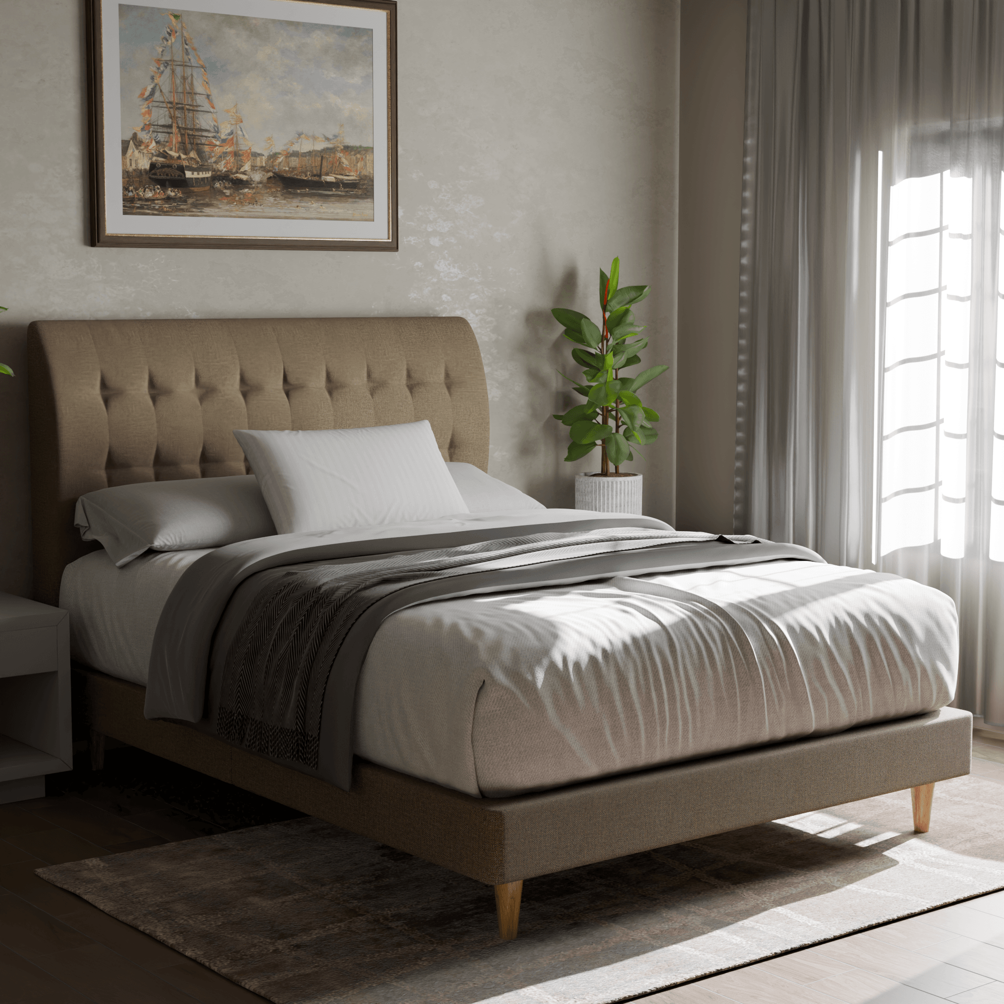 - Solid plywood and polyester fabric bedframe