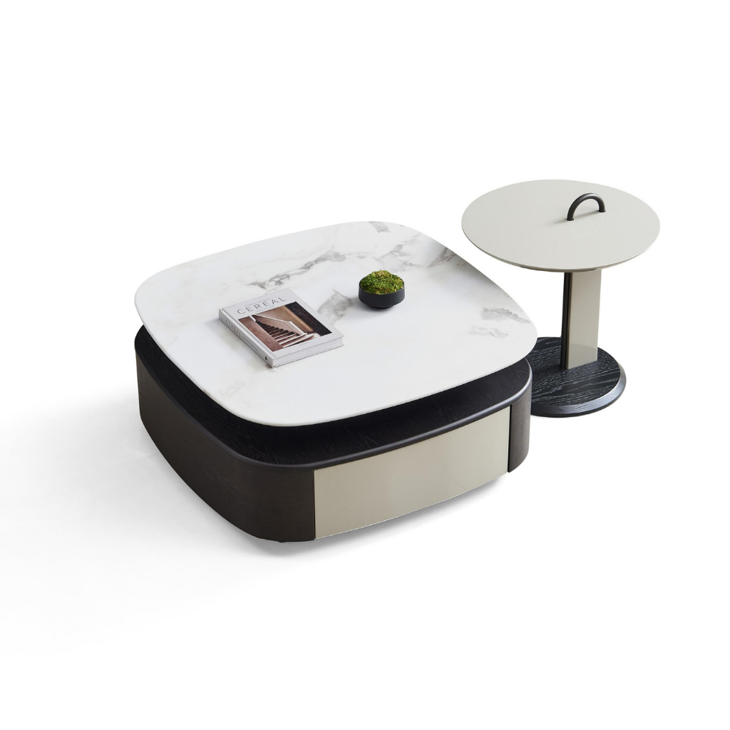 Modular Two-Piece Design: Features an elegant square main table with a subtly rounded top and a contrasting circular side table. The flexible arrangement allows for a dynamic and customizable display.