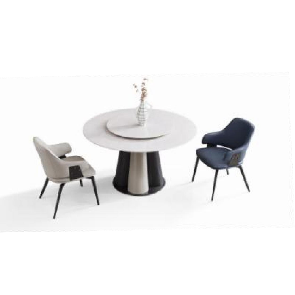 The generous tabletop features elegant, pale Natural Marble, likely in a classic white or light grey, ensuring a premium, polished dining surface. The top also incorporates Esteller's signature two-tiered design, with an upper disc providing a unique visual layering effect.