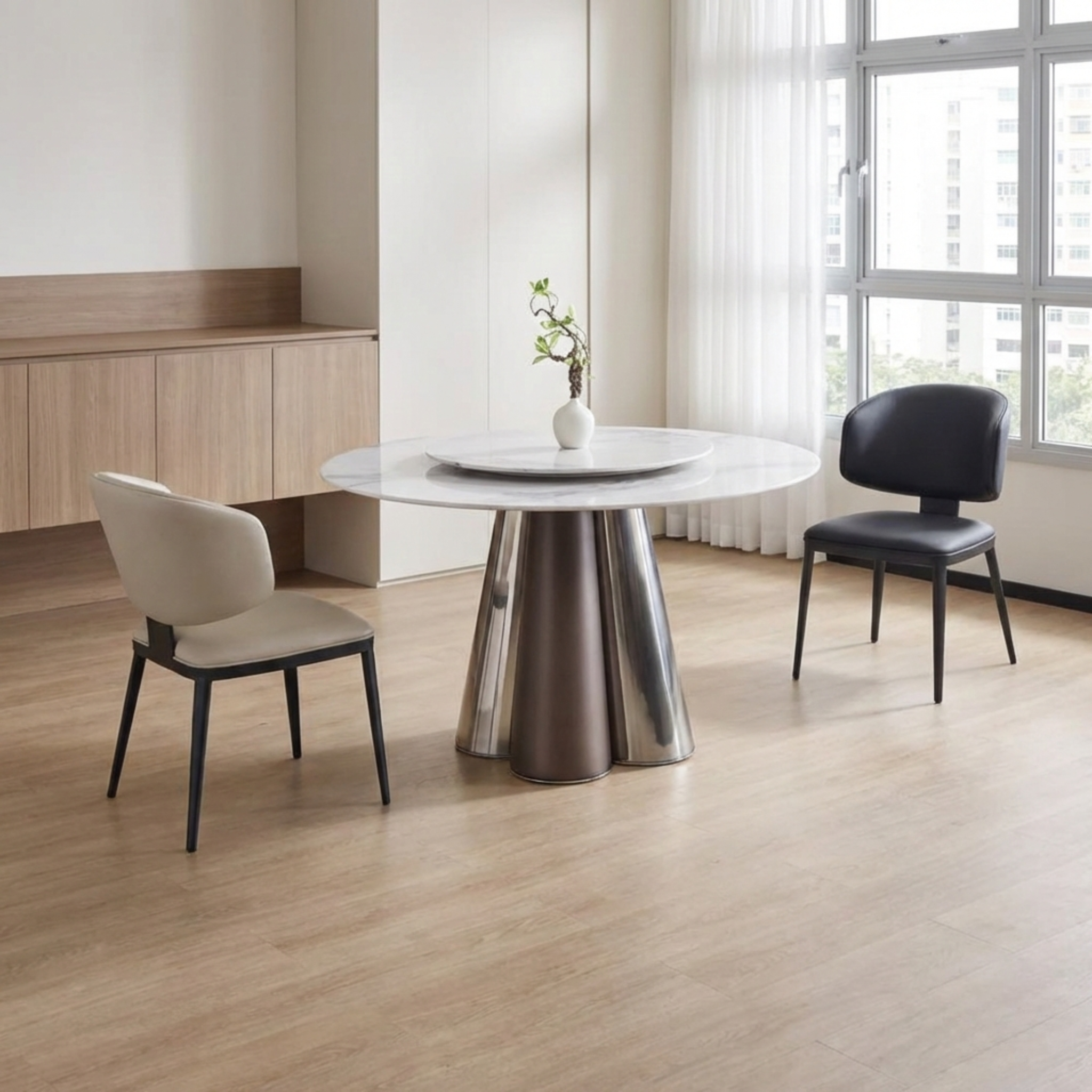 The contrast between the luxurious, cool marble and the dramatic base materials ensures the table serves as a definitive statement piece in any dining room.