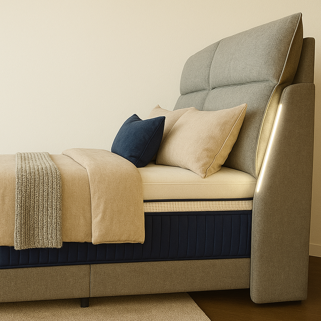 The tall, cushioned headboard offers plush back support for lounging or reading, while the integrated warm LED night lights provide subtle illumination for a cozy, calming ambiance at night. Built on a sturdy divan base with a timeless grey finish, the Trinden delivers both style and practicality, blending seamlessly into any contemporary or minimalist interior.