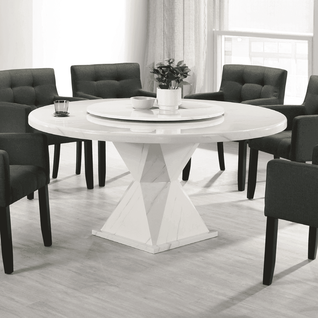 Spice up your dining space with the Kirra Round Marble Dining Table, featuring a white marble top and a playful lazy susan for easy serving. Elevate your meals with a touch of elegance and convenience.