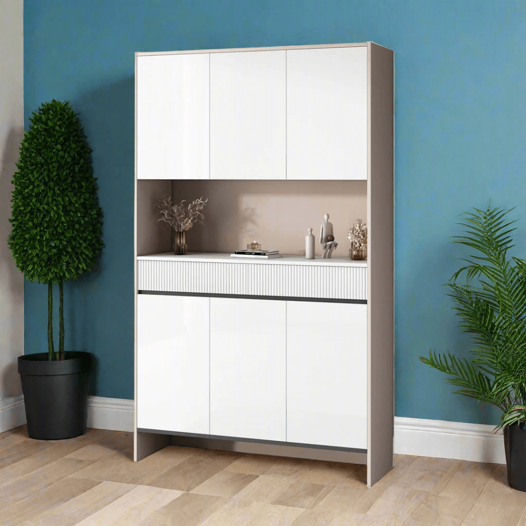 The Clarisse Tall White Shoe Cabinet (119cm) is specifically designed to fit in compact spaces. The open shelf provides convenient storage for essential items like keys. Its glossy white finish and matte khaki side panels give it a sleek and modern look.