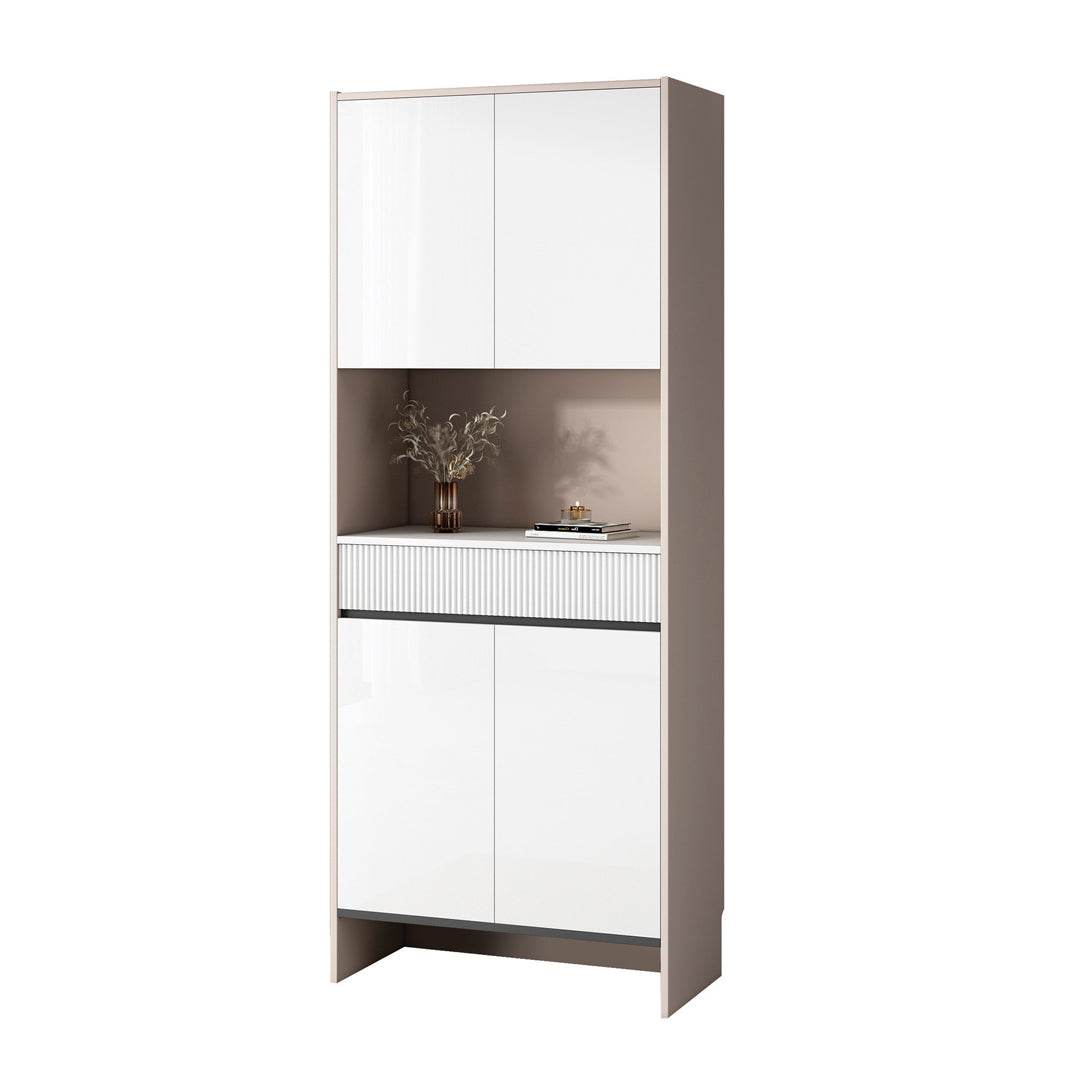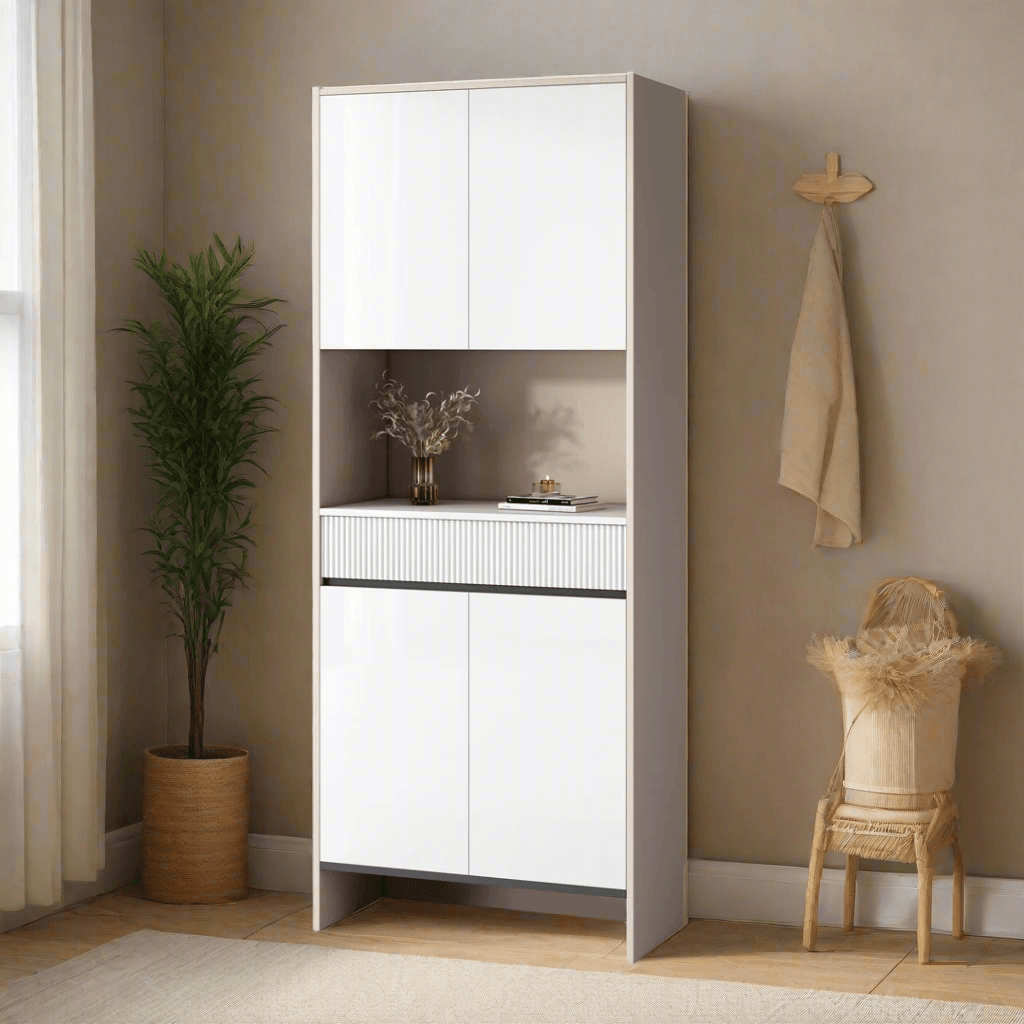 The Clarisse Tall White Shoe Cabinet (80cm) features a slim design perfect for compact spaces. With 4 doors (split between the top and bottom), this cabinet provides ample storage space while maintaining a sleek appearance. An open shelf is conveniently located for storing essential items, such as keys. The glossy white finish and matte khaki side panels add a touch of sophistication to any room.