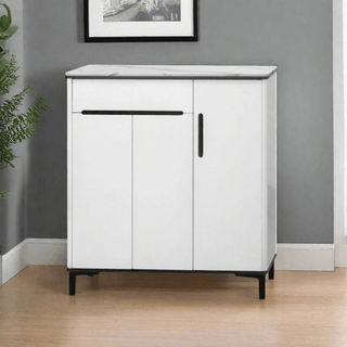 The Dalf 3-Door Shoe Cabinet offers a clean and modern aesthetic while maximizing storage space. Its minimalist white finish, laminated top, and black legs create a sleek look that seamlessly fits into contemporary interiors.