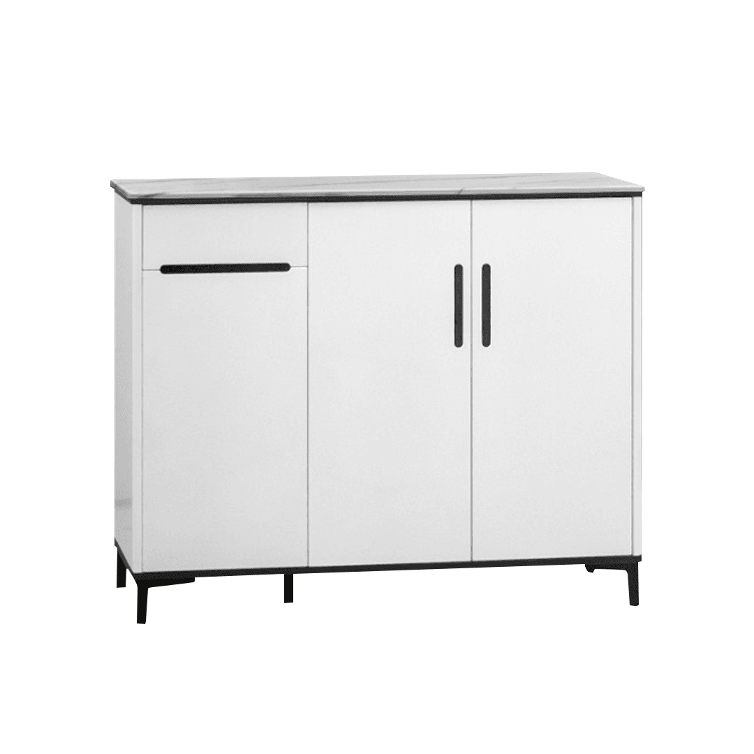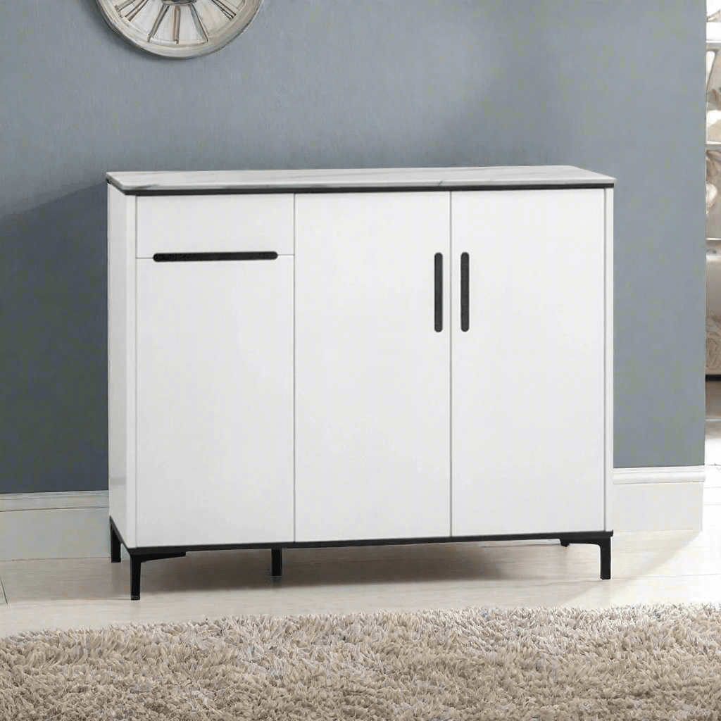 The Dalf 3-Door Shoe Cabinet offers a clean and modern aesthetic while maximizing storage space. Its minimalist white finish, laminated top, and black legs create a sleek look that seamlessly fits into contemporary interiors.