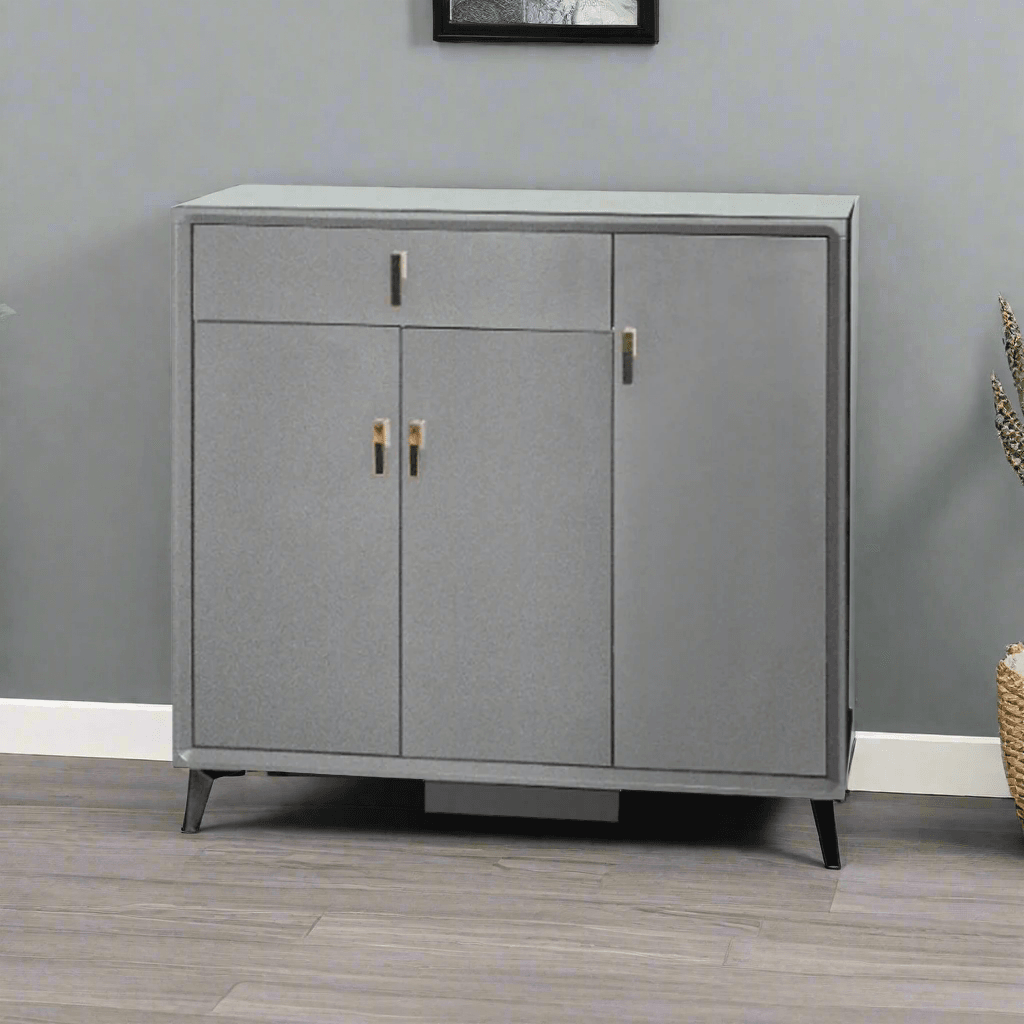 Stylish and functional, the Halcy 3-Door Shoe Cabinet provides ample storage while complementing contemporary interiors. Its grey finish, black metal legs, and additional drawer make it a perfect storage solution for any home.