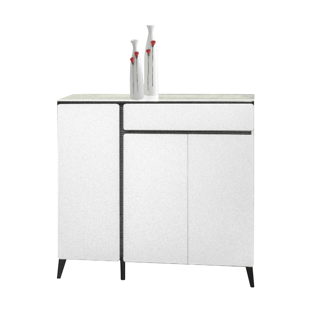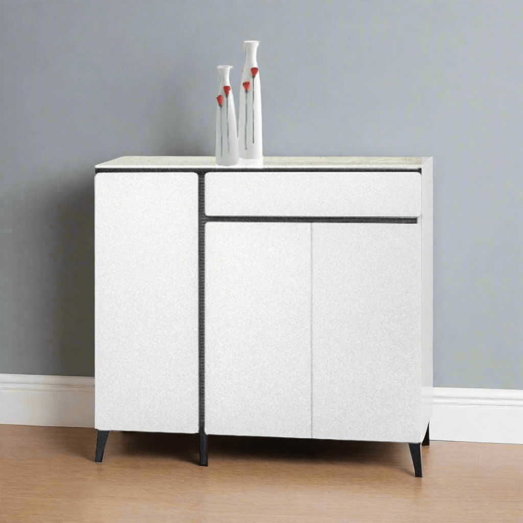 The Malcy 3-Door Shoe Cabinet combines sleek aesthetics with functionality. Featuring a white finish with black outlines, a convenient drawer, and multiple storage layers, it seamlessly fits into contemporary spaces.