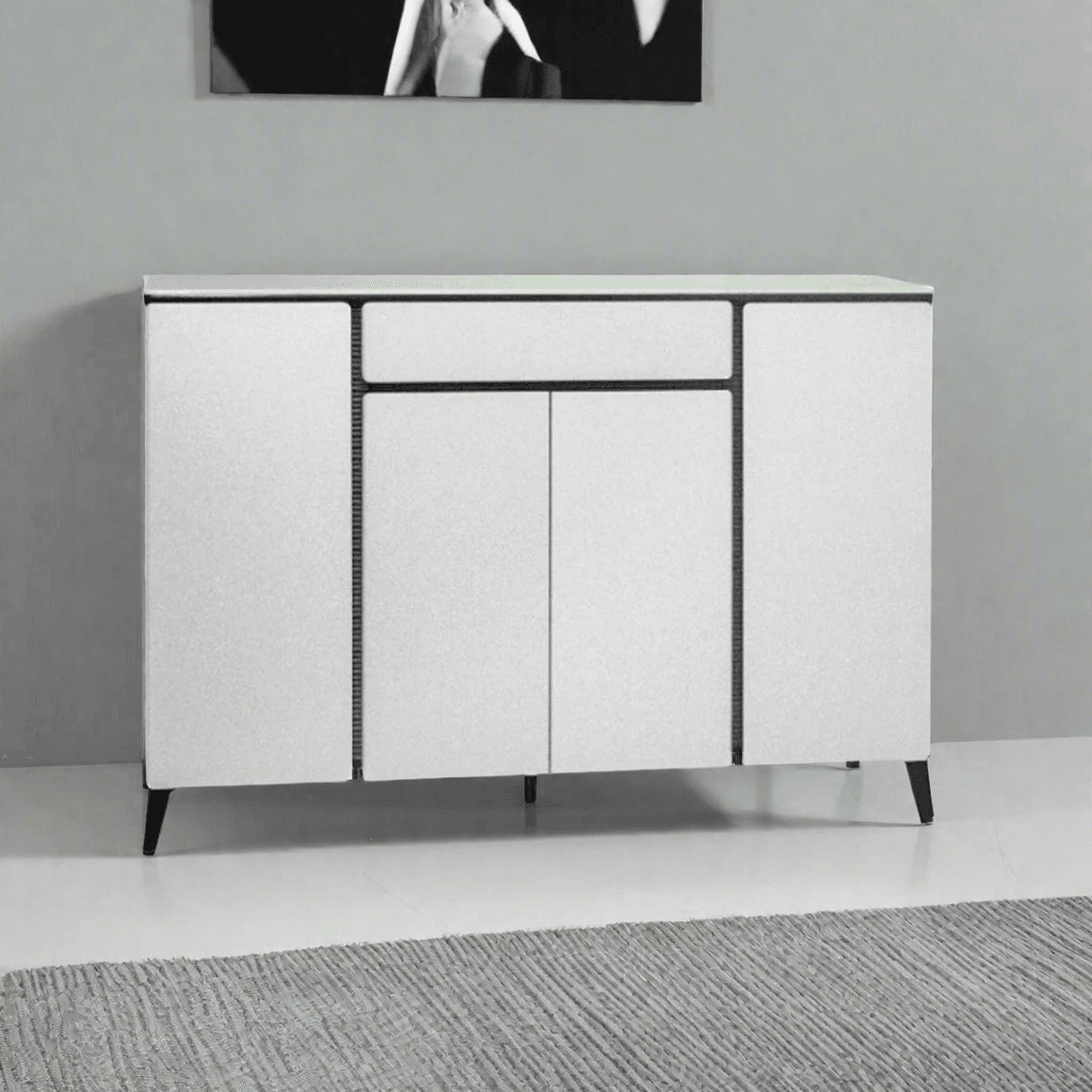 The Malcy 3-Door Shoe Cabinet combines sleek aesthetics with functionality. Featuring a white finish with black outlines, a convenient drawer, and multiple storage layers, it seamlessly fits into contemporary spaces.