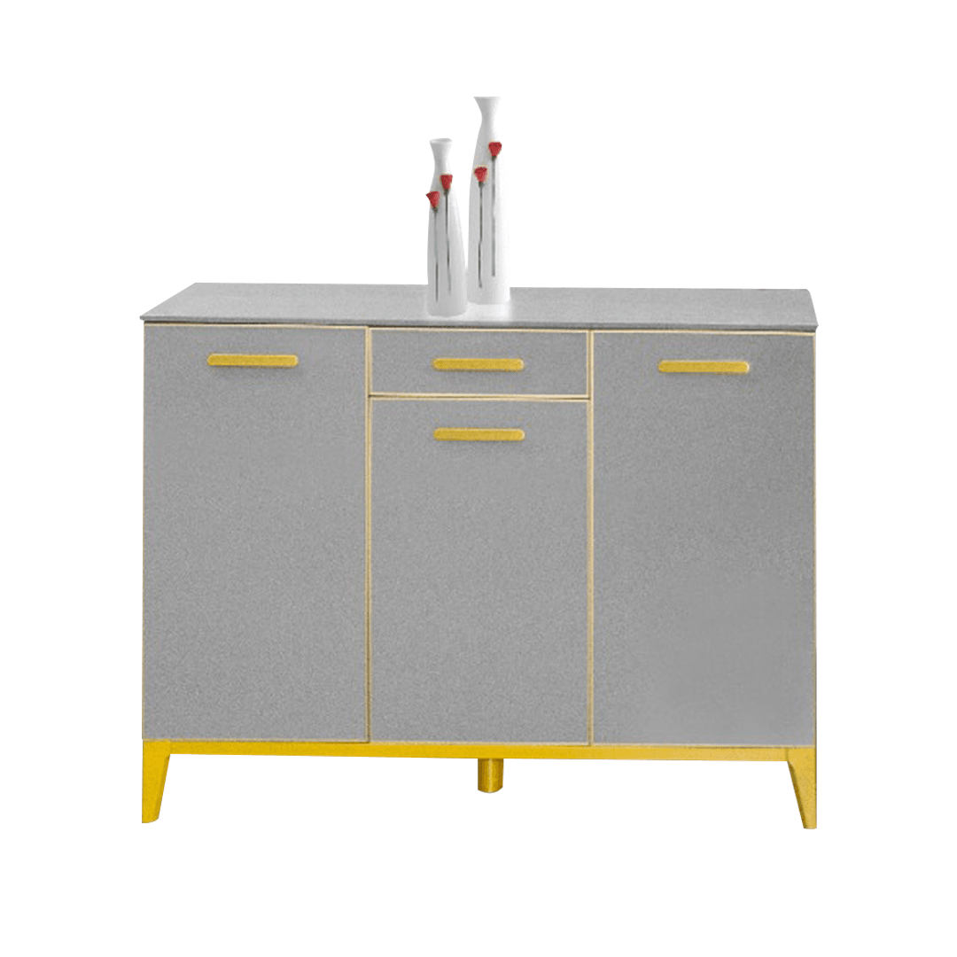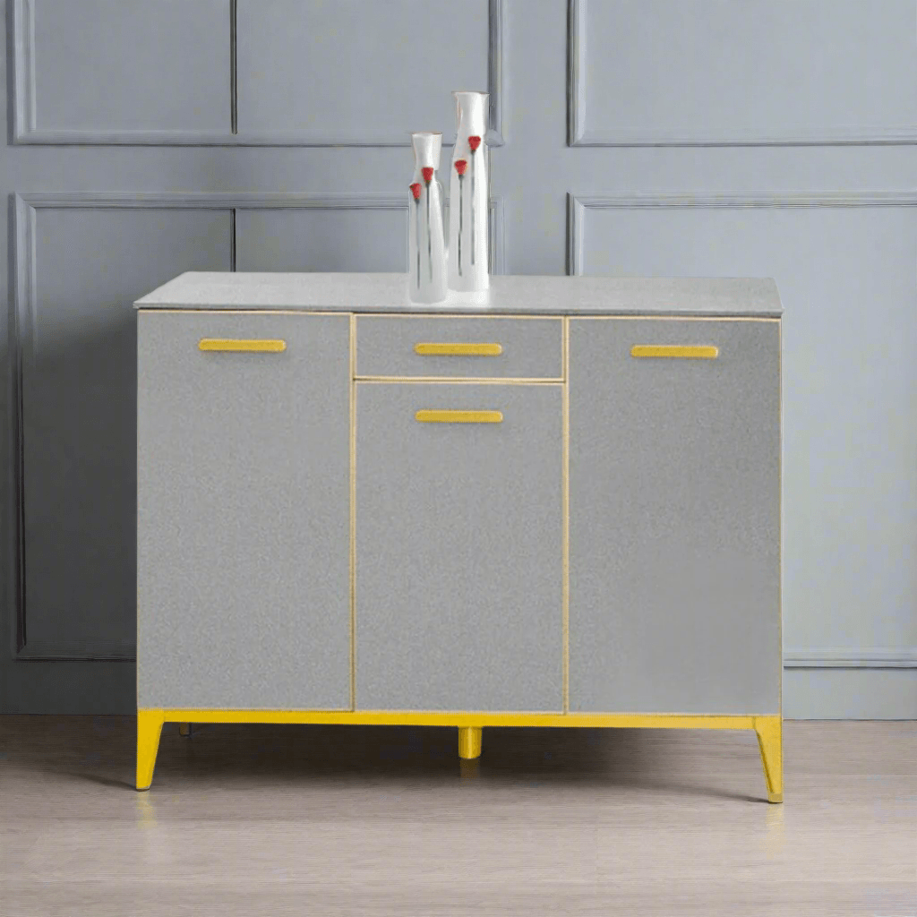 The Palcy 3-Door Shoe Cabinet blends sophistication with practicality. Featuring glossy grey doors, a luxurious brushed champagne gold frame, legs, and handles, and a convenient drawer, this cabinet is a stylish storage solution for any modern interior.