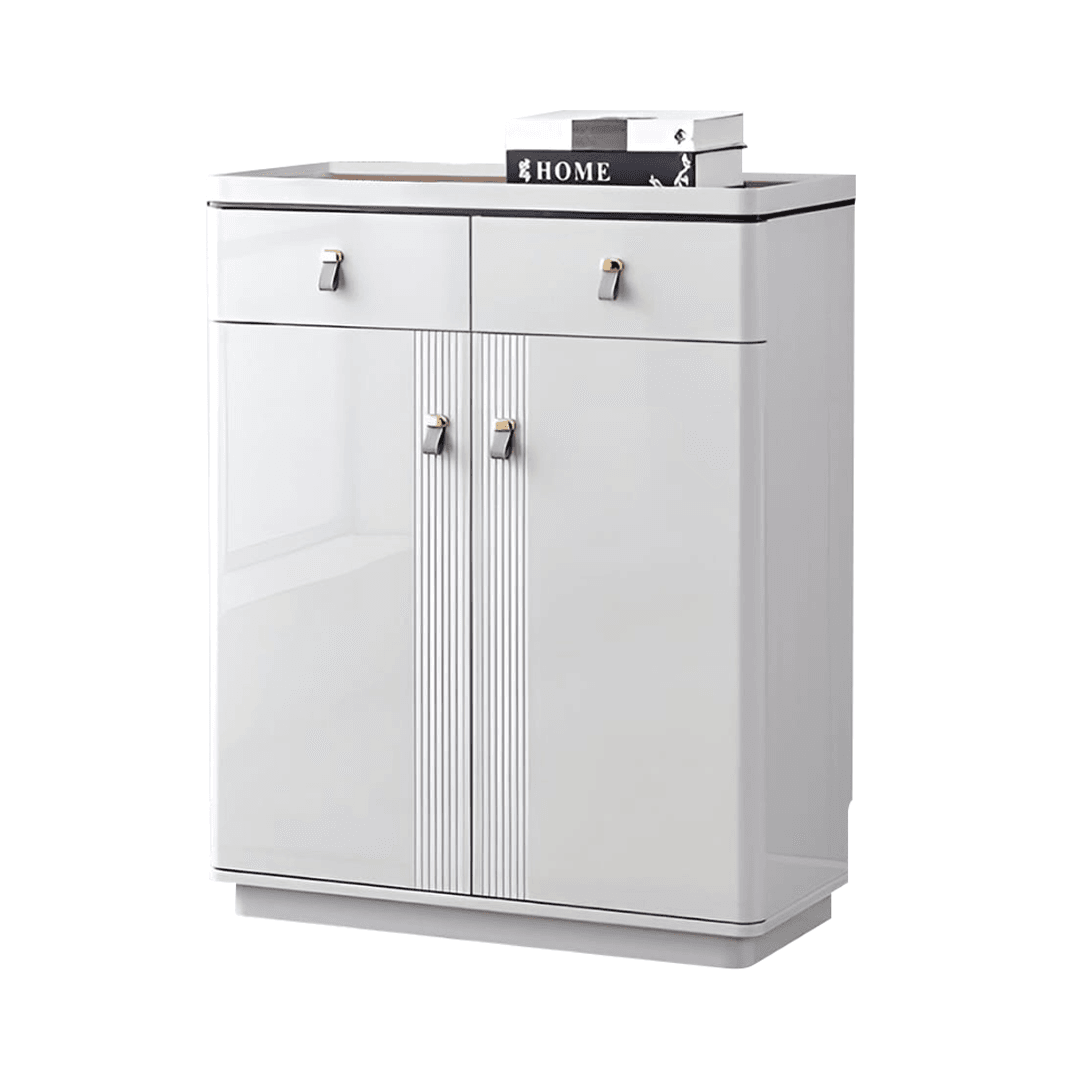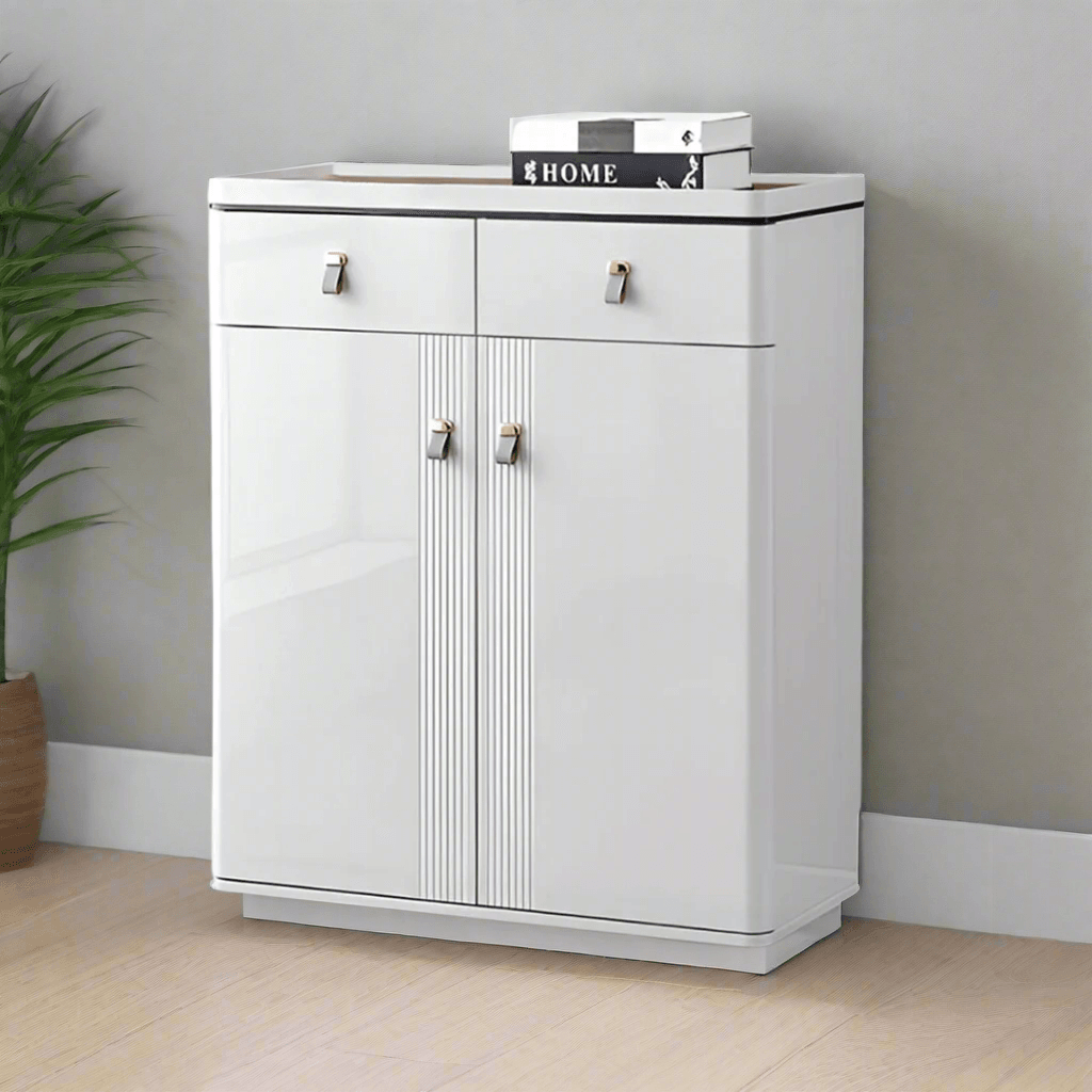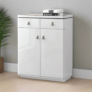 The Paura 2 Door Shoe Cabinet is a perfect blend of functionality and contemporary aesthetics. Designed with a high-gloss finish and a tempered glass top, this cabinet adds a refined touch to any home. Its spacious interior features two drawers and four layers of storage, making it ideal for organizing shoes, accessories, and more.