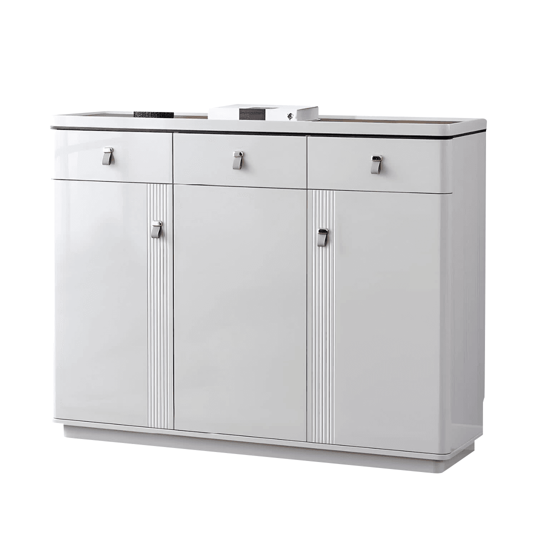 The Paura II 3-Door Shoe Cabinet is a refined storage unit designed for modern living spaces. Its high-gloss finish and tempered glass top provide a sophisticated touch, while three drawers and four storage layers ensure ample organization for shoes and essentials.