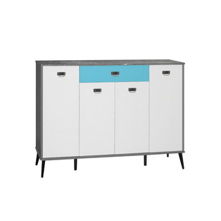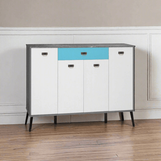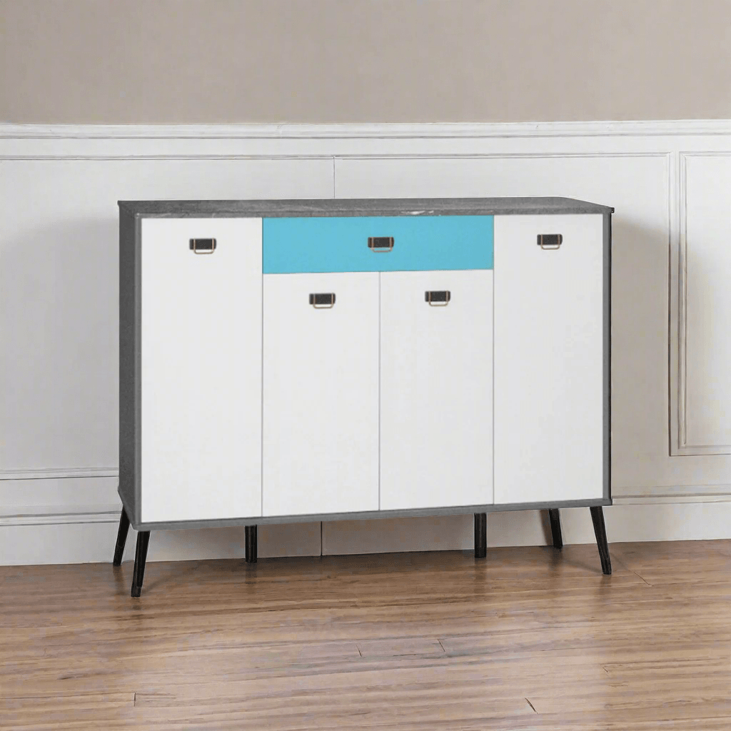 Designed for modern homes, the Walcy 4-Door Shoe Cabinet combines neutral tones with a touch of color. Featuring a grey frame, white doors, and a light blue drawer, this cabinet offers both function and style. Its five-layer storage design helps keep footwear neatly organized while complementing contemporary interiors.