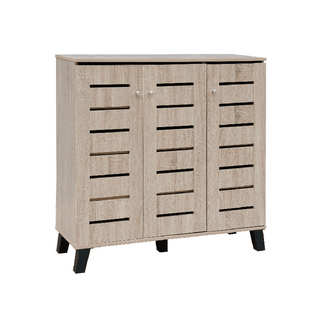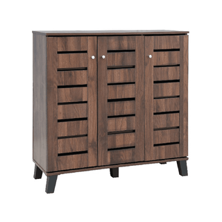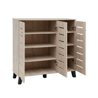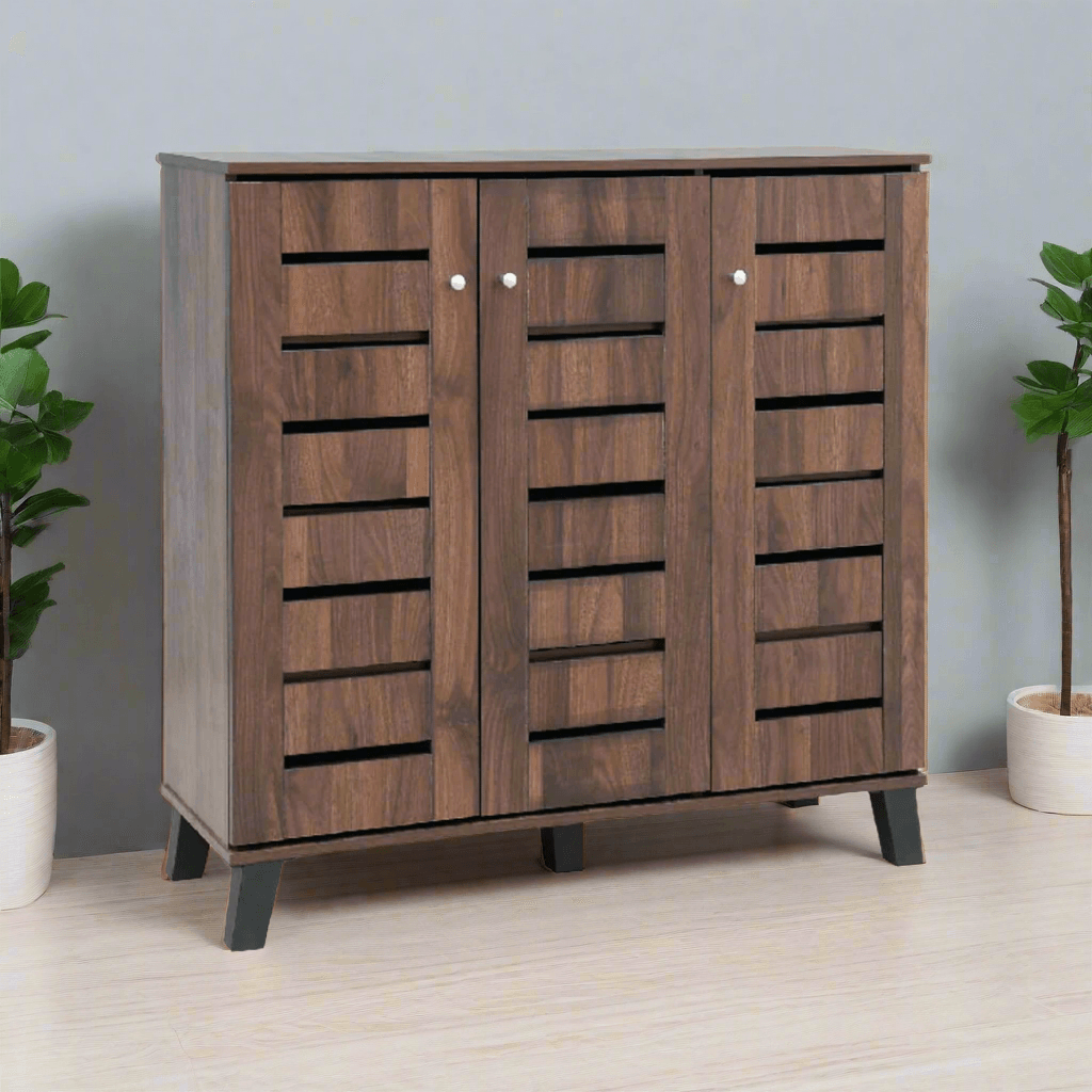 The Warrick Wooden Shoe Cabinet (90cm) offers a balanced blend of function and style, perfect for keeping your entryway or bedroom organized. Made from sturdy particle board, it features three doors with built-in ventilation holes to allow airflow and prevent shoe odours. Its horizontal profile provides ample storage while doubling as a platform for decorative or daily-use items.