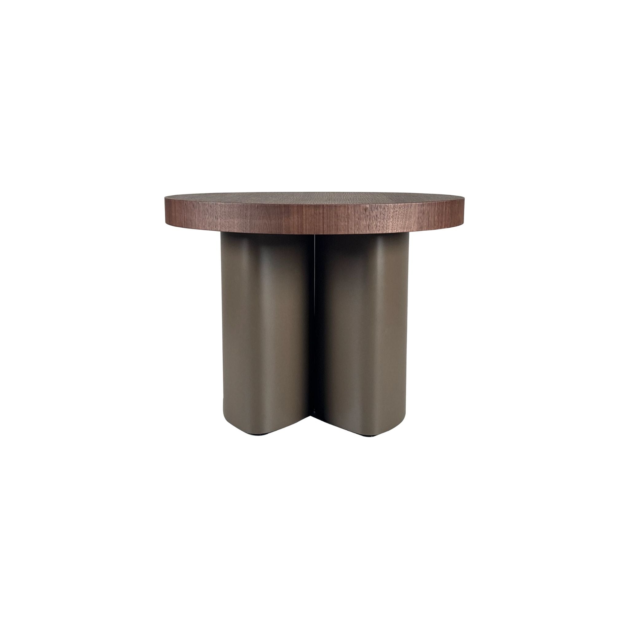 Supporting the design is a sculptural base finished in metallic paint, crafted in a distinctive cross-shaped formation with softly rounded edges. This architectural silhouette balances strength and elegance, while the interplay of warm walnut and cool metallic tones creates a refined, contemporary contrast.