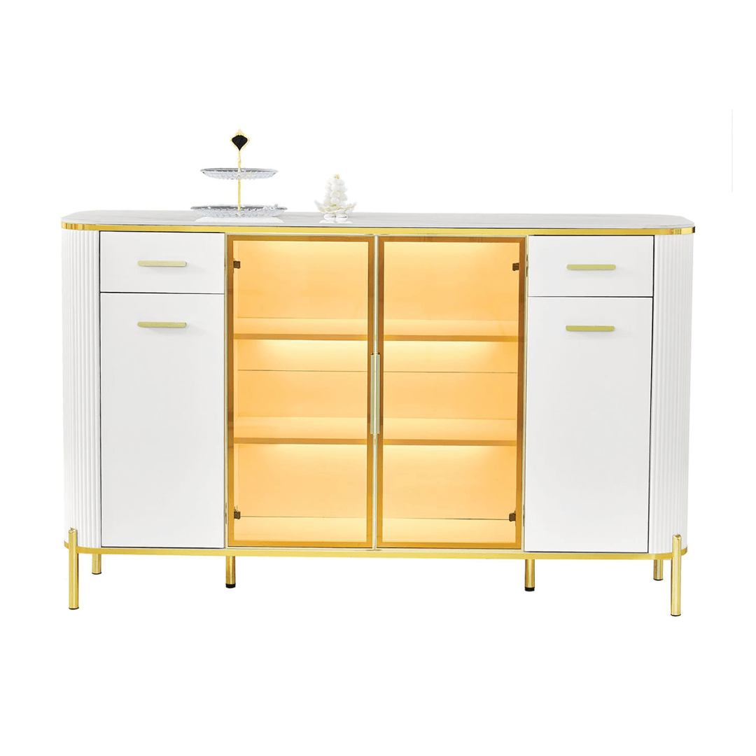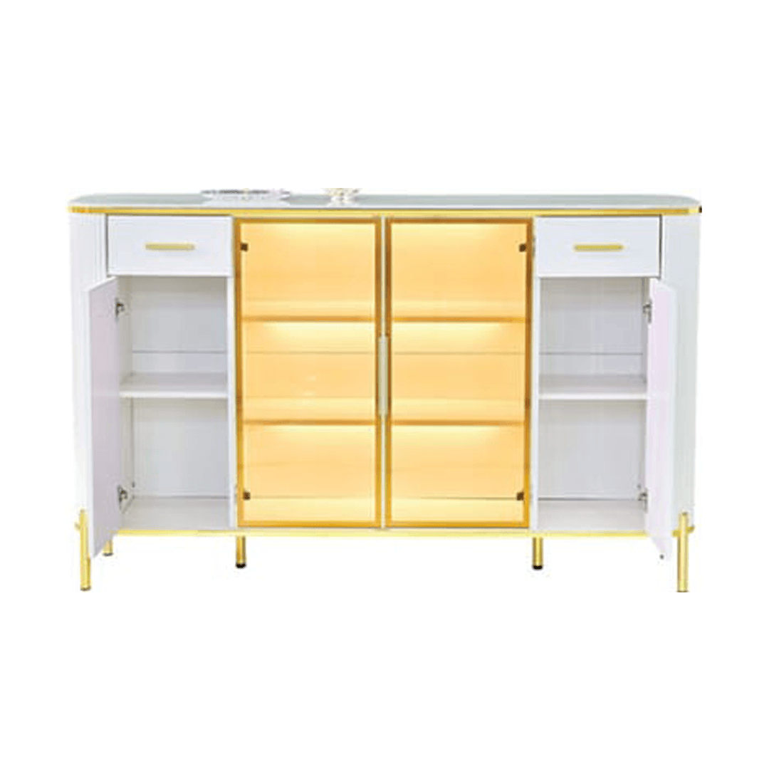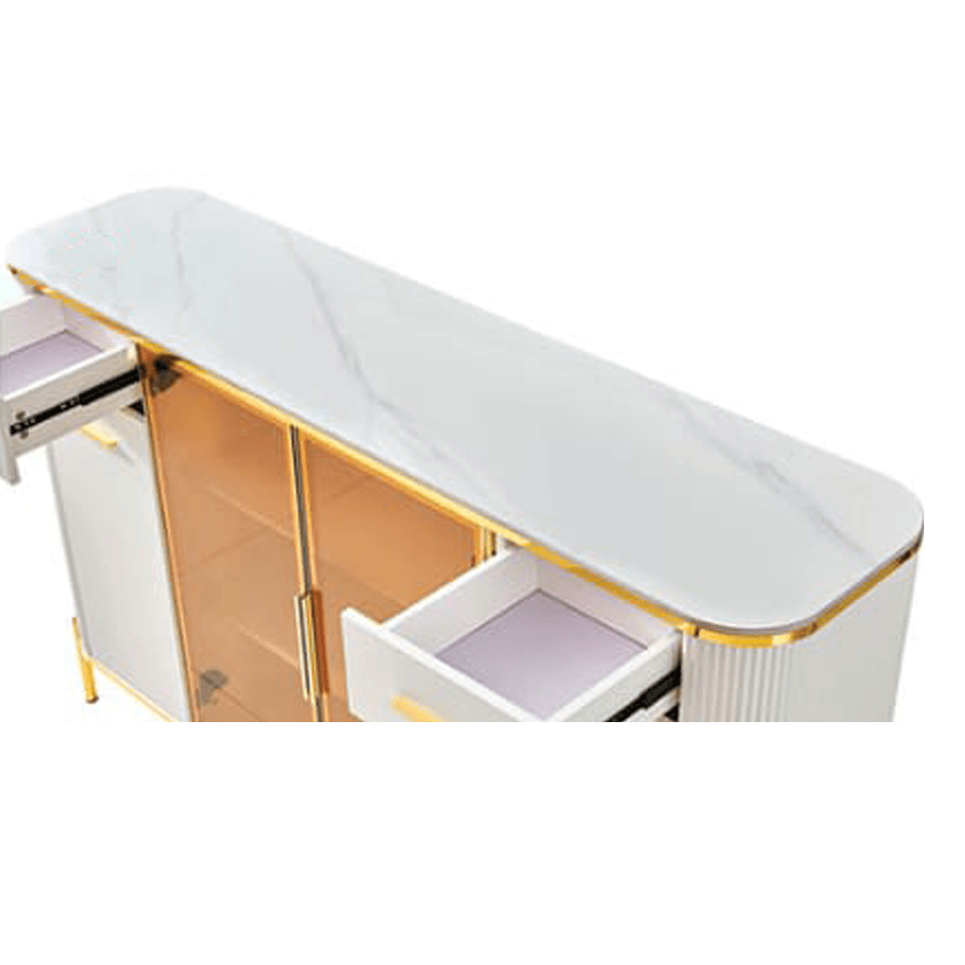 The Maurille White Buffet Hutch (160cm) is designed to complement modern interiors with its sintered stone top, high-gloss white finish, and gold-colored legs. Offering a perfect balance of style and functionality, this hutch is ideal for organizing dinnerware, decor, and everyday essentials.