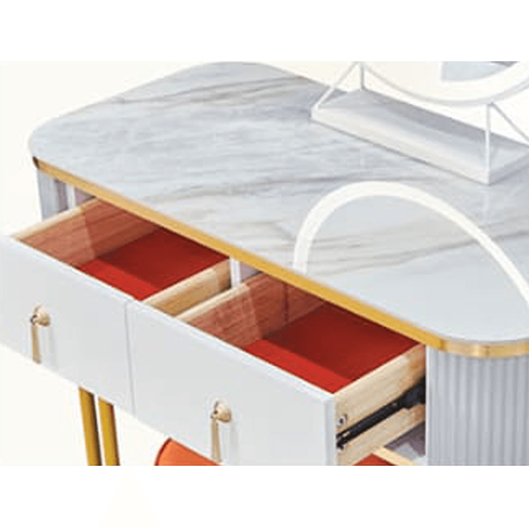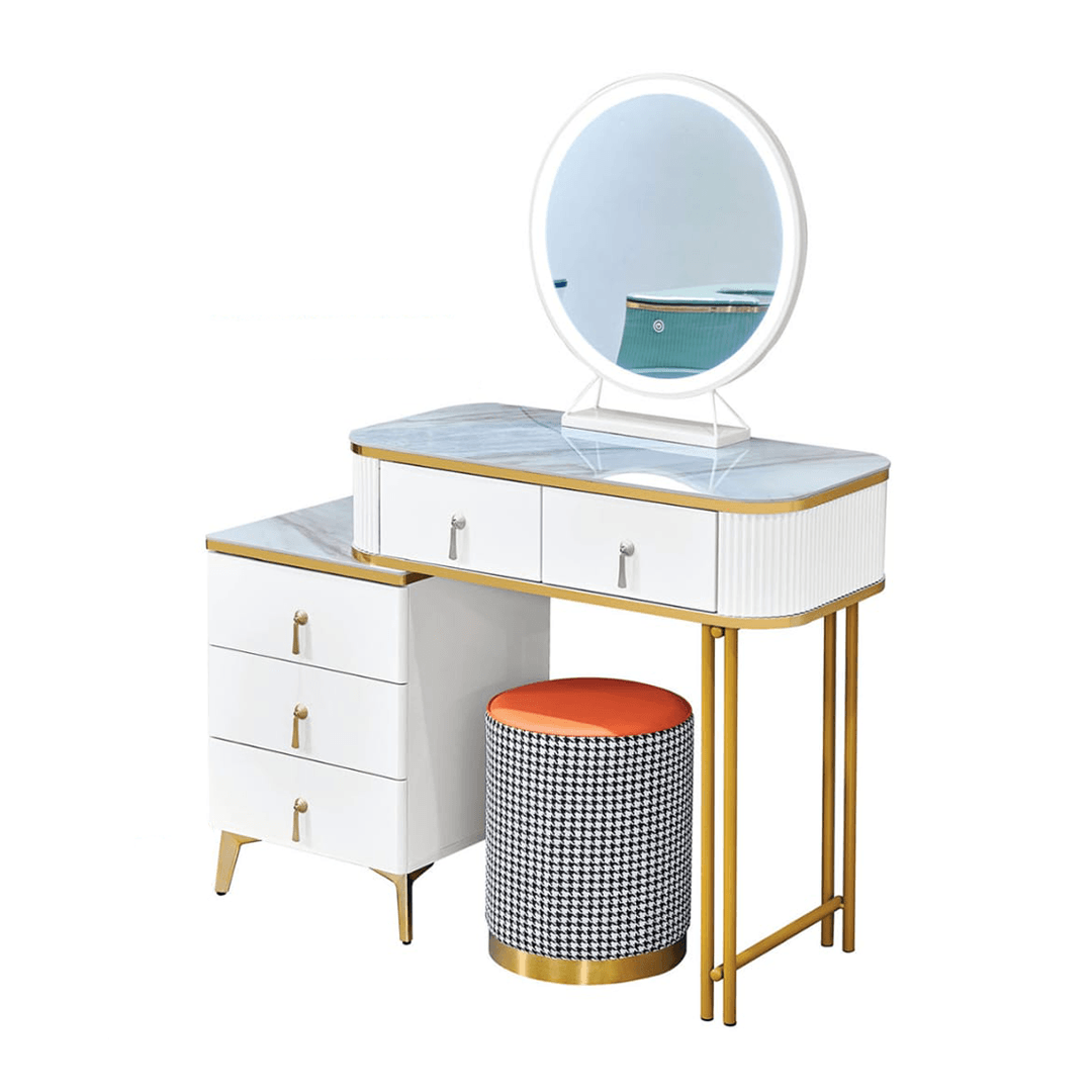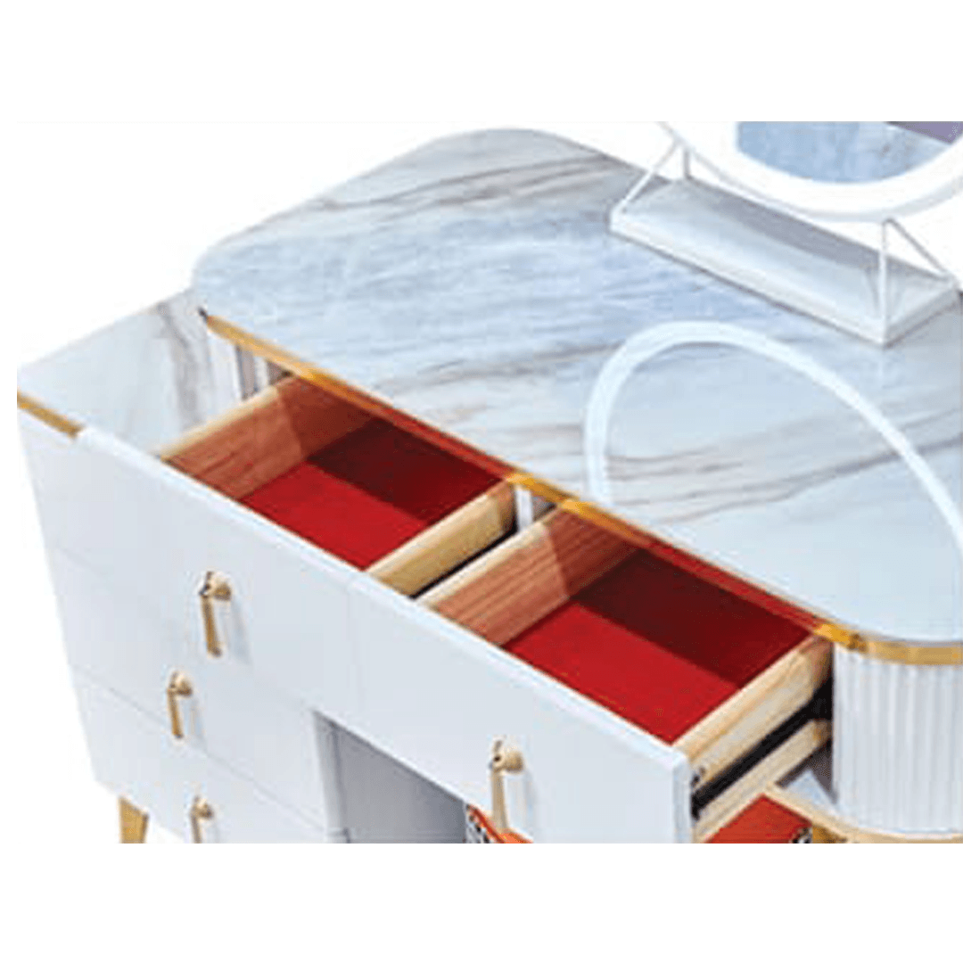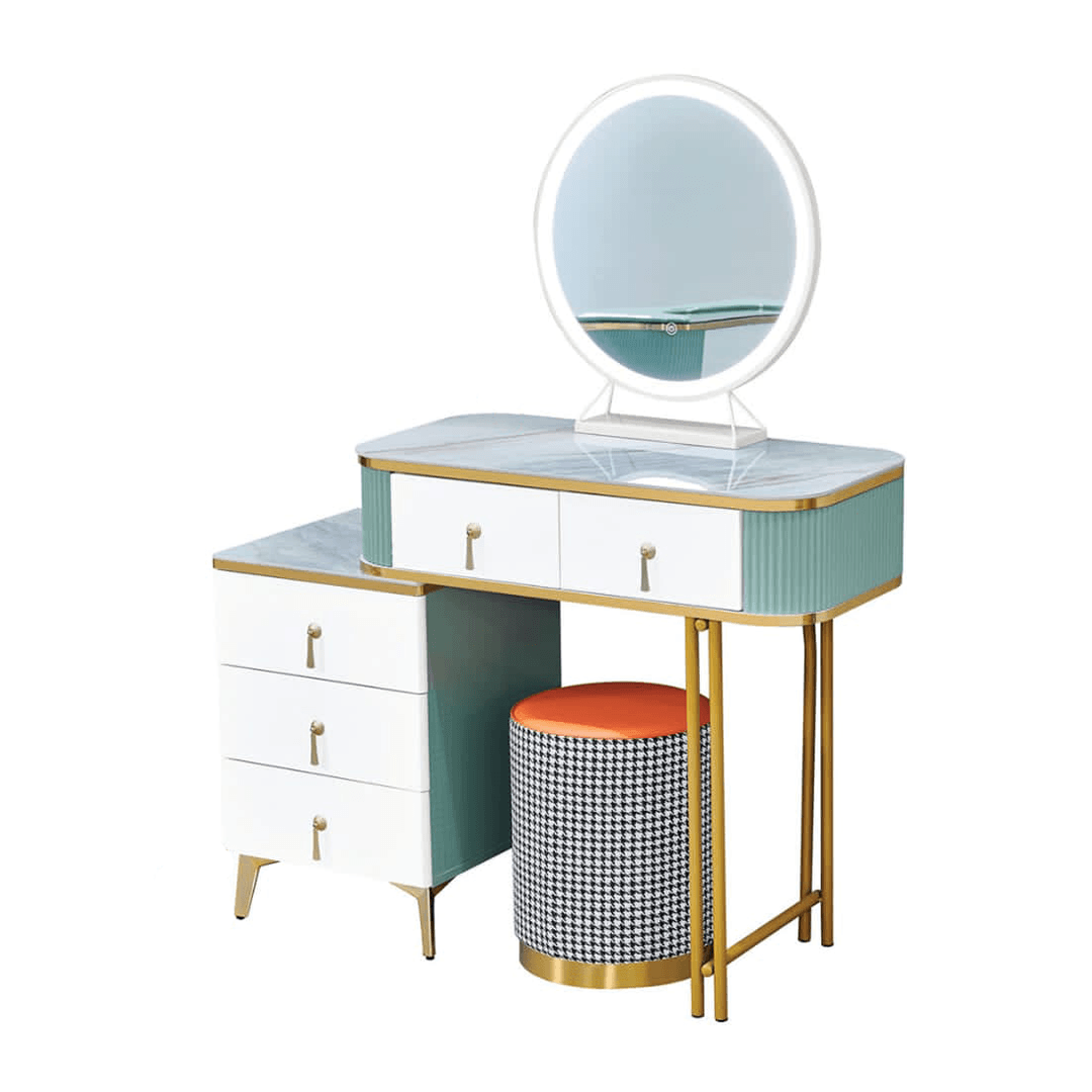Elevate your vanity space with the Brianna Sintered Stone Extendable Dressing Table, a luxurious blend of functionality and modern elegance. Designed with a glossy sintered stone top, an LED-lit mirror, and five spacious drawers, this dressing table offers both durability and sophistication. Its extendable design allows for adaptable space usage, making it a perfect fit for compact and larger interiors alike.