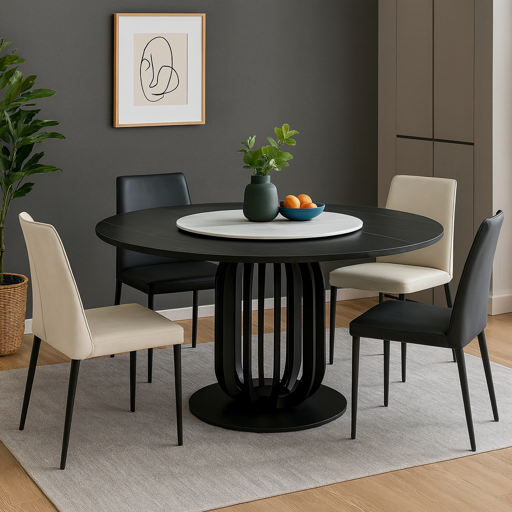 At the center sits a built-in Lazy Susan, allowing effortless serving and a touch of convenience for family-style dining. Its sleek round silhouette encourages connection, making every meal more intimate and enjoyable. The sturdy, artistic pedestal base adds a statement of contemporary sophistication to any dining space.