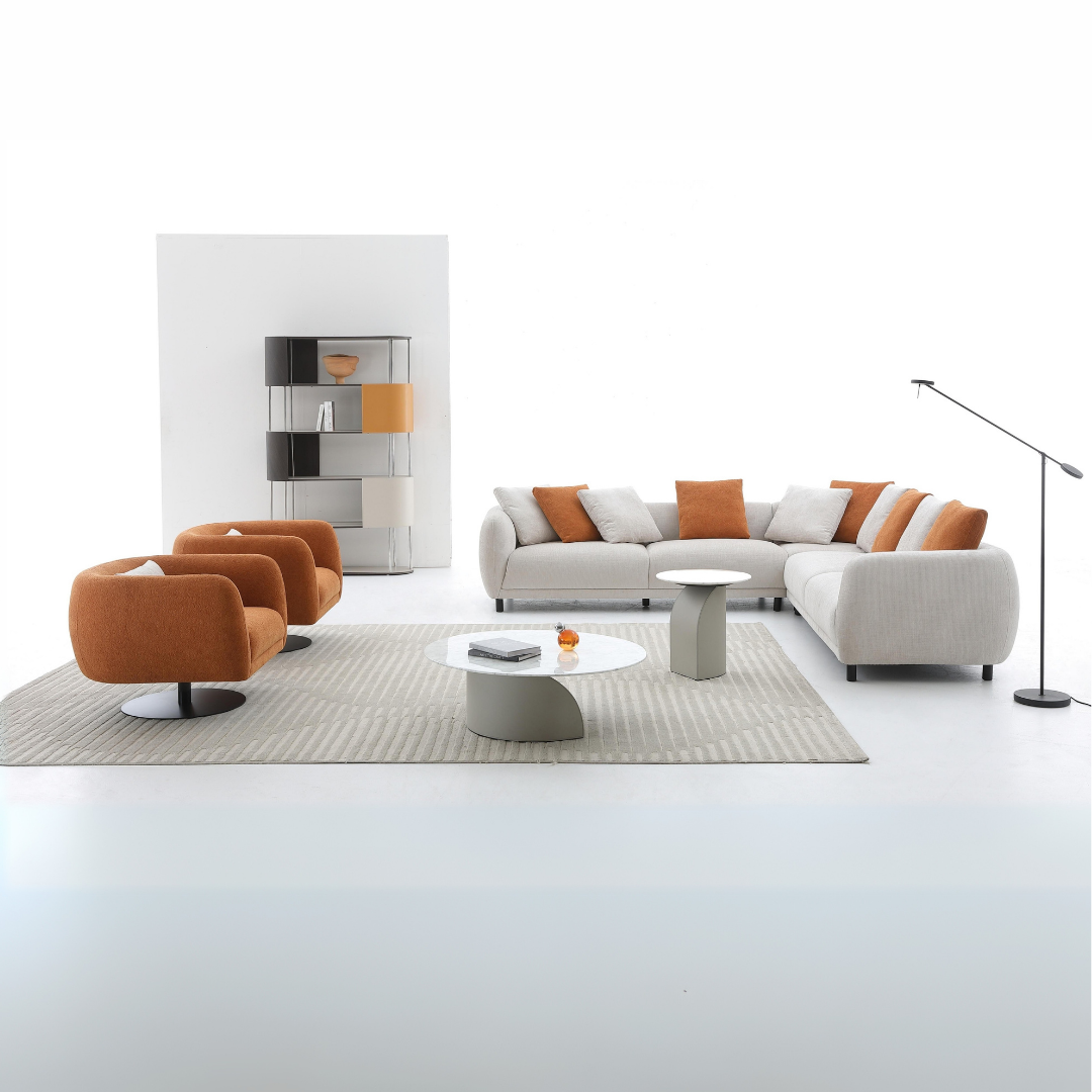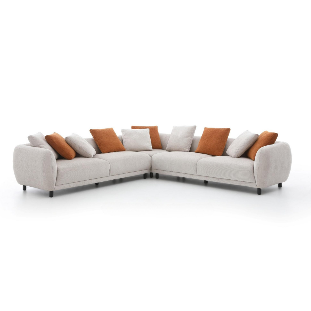 The Polarine Sectional L-Shaped Fabric Sofa is where modern design meets luxurious comfort. Wrapped in soft, high-quality fabric, its smooth curves and generous proportions create an inviting statement for any living space. The deep, cushioned seating and supportive backrest ensure comfort for long hours of lounging or entertaining, while the warm mix of neutral and accent cushions adds a touch of personality. Its sleek, low-profile black legs balance the plushness with a clean, contemporary finish.