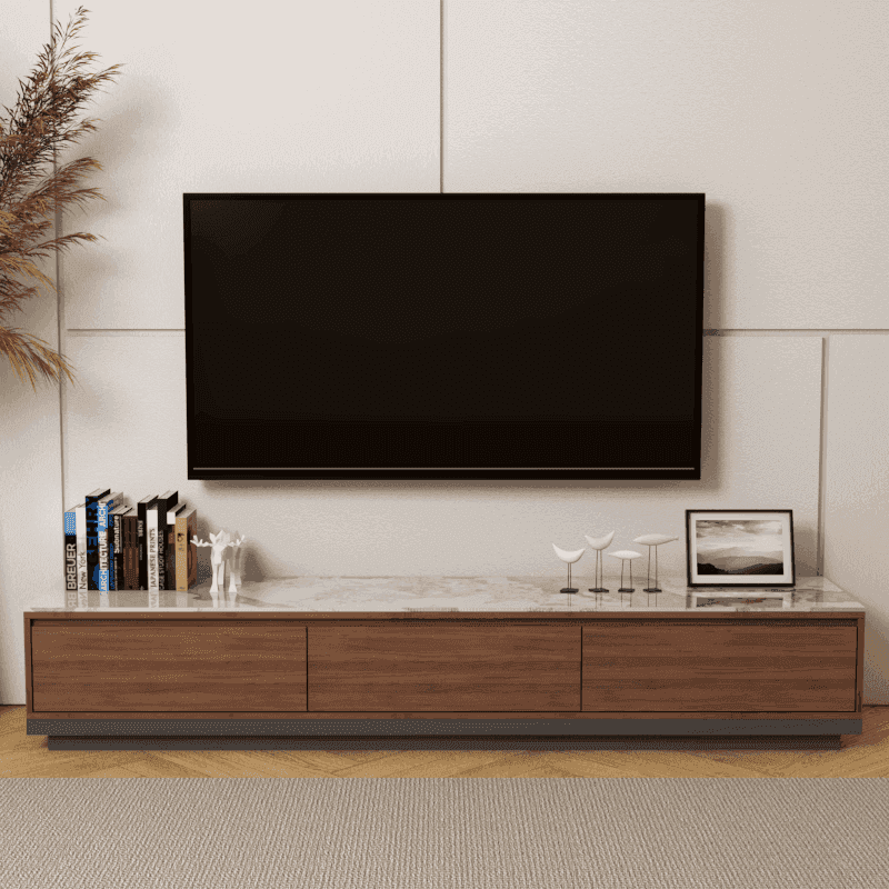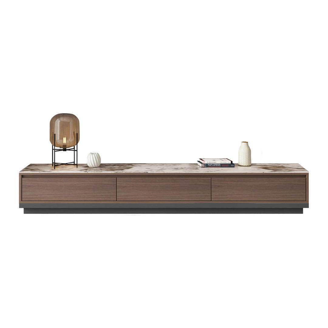 If you plan to amp up your living room with gloss and glam, check out the Azeriel Glossy Sintered Stone TV Console. This stunner is stylish and practical. This console's glossy brown sintered stone top isn't just a visual treat; it's super sturdy and a breeze to clean, so you don€™t have to worry about spills and stains.