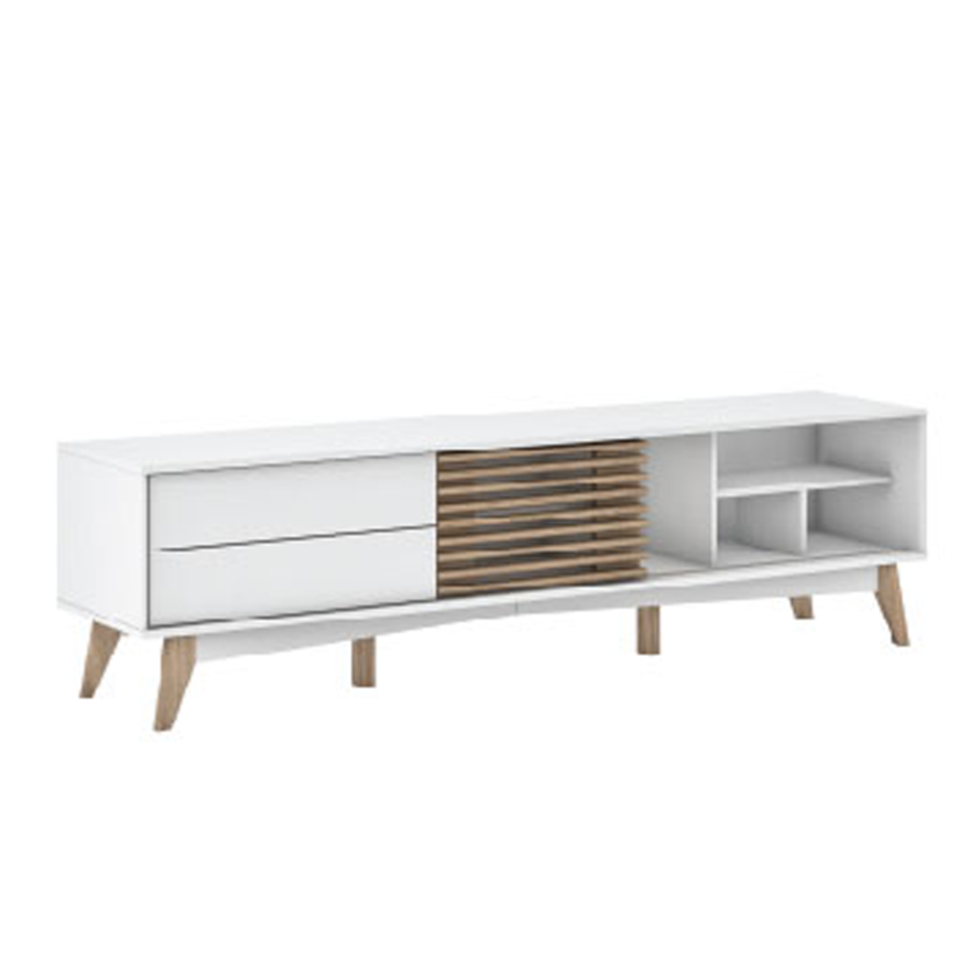 Designed for both style and functionality, this console comes with 2 drawers on smooth metal slides with a push-open system, an open shelf for easy access to media devices, and half-concealed storage hidden behind a sleek sliding door to keep your living space organized and tidy. Perfect for large TVs and stylish enough to elevate any entertainment area.