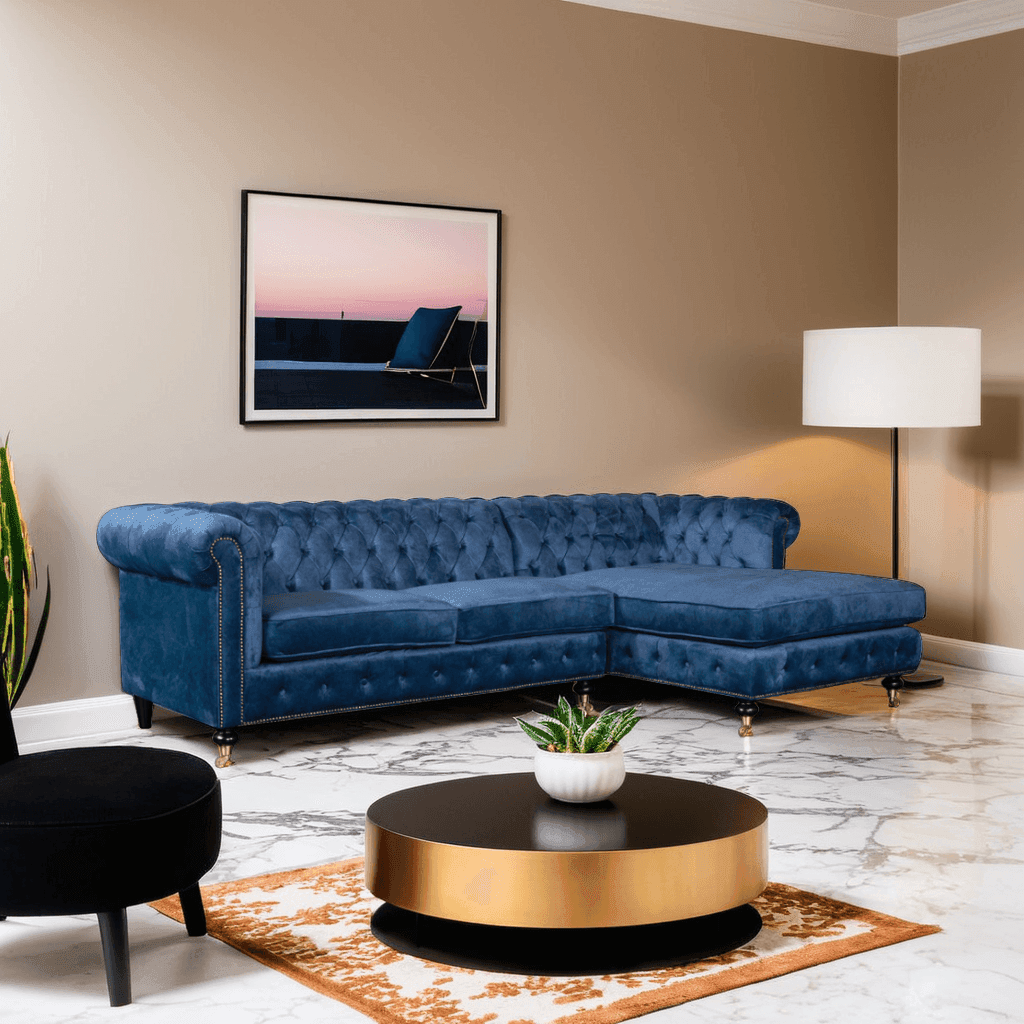 Indulge in luxury with our Gimorie Chesterfield Fabric L-Shaped Sofa. With its elegant design and high-quality fabric, this sofa will elevate your living space and provide ultimate comfort. The classic Chesterfield style is perfect for any sophisticated home.